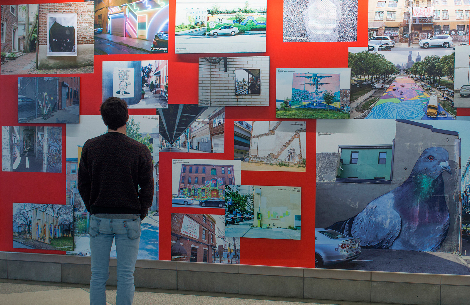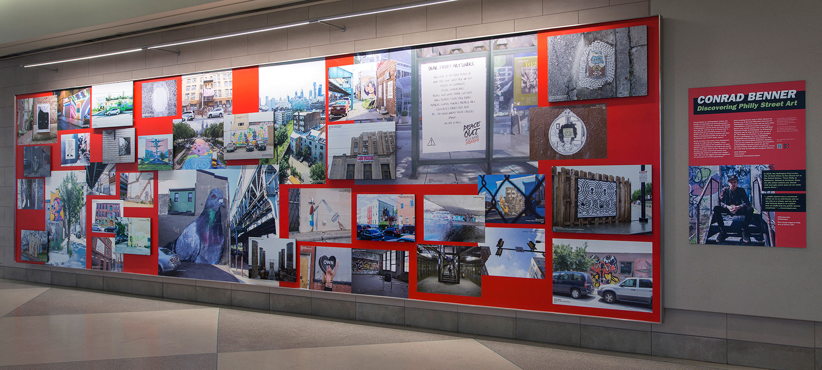 In Terminal D, you find Conrad Benner’s “Discovering Philly Street Art.” Benner is a local photographer and curator who is dedicated to promoting street art in Philadelphia, and his installation is comprised of a wall of layered photographs which celebrate the street art scene in the city. The display includes work by many notable Philadelphia artists including Shawn Theodore, David Guinn, Michelle Angela Ortiz, and Kid Hazo, and provides an engaging glance at some of the city’s superb graffiti, murals, public art and architecture — a wonderful introduction to Philadelphia. It will be exhibited through October.