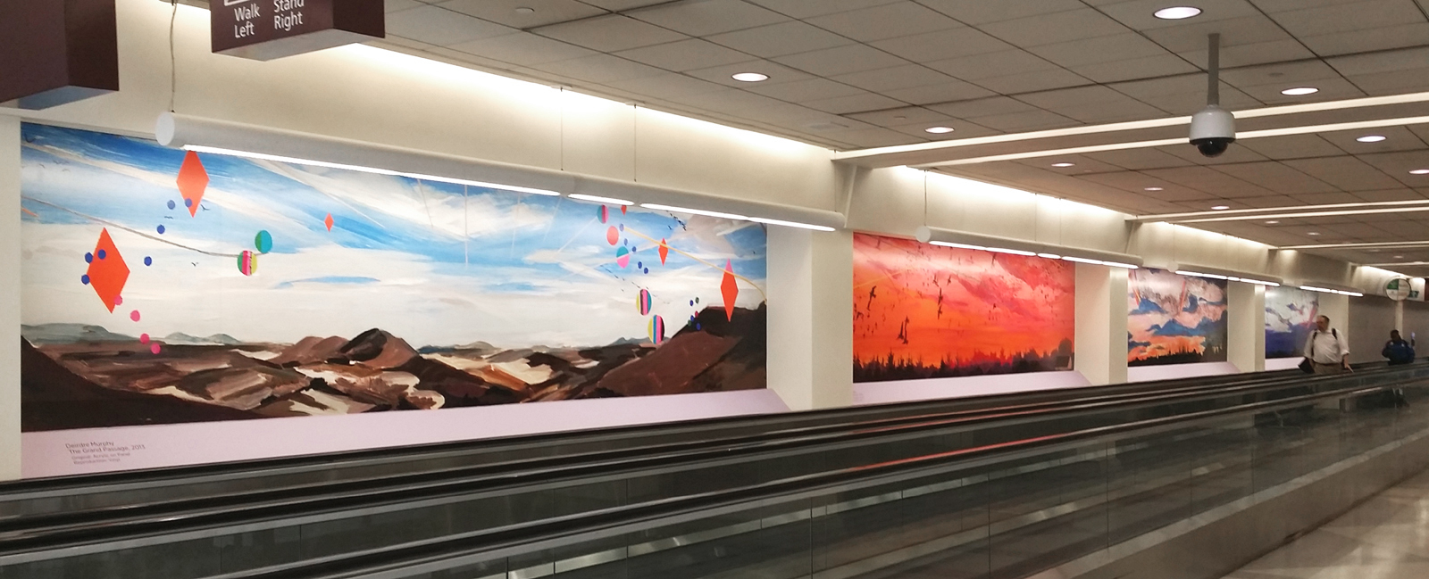 Between Terminals C and D, on a wall along a moving walkway, stretch four glorious “Sky Paintings” by Philadelphia artist Deirdre Murphey, which feature colorful landscapes, birds, clouds, sunsets, and some whimsical kite-like abstractions. The scale and panoramic nature of this work makes you feel as if you’re moving through a national park, not standing in airport passageway.