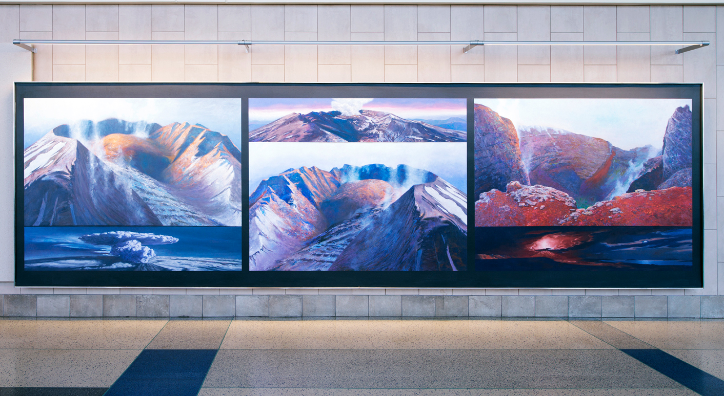 Charles Schmidt’s renderings of “Mount St. Helens” and “Mount Vesuvius” also hang in Terminal F, and will be on view through June of this year. Like Deirdre Murphy’s “Sky Paintings,” Schmidt’s work transports you far beyond the institutional and commercial environment of the airport and into the magnificent landscapes of these colossal volcanoes. The unusual aerial perspectives and glowing, muted hues of Schmidt’s paintings seem otherworldly.