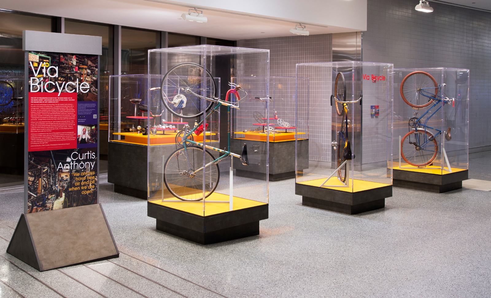 “Custom Bikes” presents a collection of the work of five Philadelphia bike builders – Bilenky Cycle Works, Engin Cycles, Firth & Wilson Transport Cycle, Haley Tricycles, and Woody Bicycles. The artistry and design innovation of these craftsmen is extraordinary.
