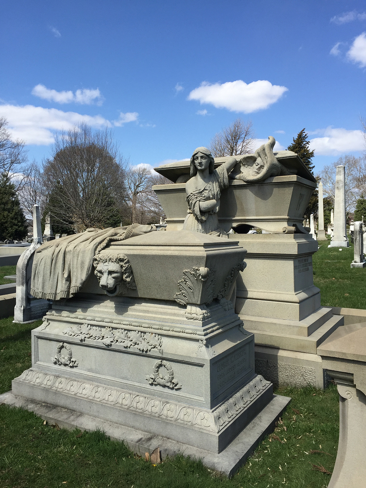 Now designated as a National Historic Landmark, Laurel Hill Cemetery was founded in 1836 by Quaker John Jay Smith as one of the nation’s pioneering garden cemeteries. In traditional Quaker style, Laurel Hill’s earliest burial plots are marked with modest, trip-hazard sized stones simply engraved with names and dates. It wasn’t until after 1837, the start of the Victorian era, that flamboyant stone monuments became prominent. Today, Laurel Hill features over 33,000 eclectic monuments, ranging from massive Egyptian obelisks, conventional tombstones, religious relics and tiny-house scaled mausoleums, to rather uncanny life-like sculptures of the deceased.