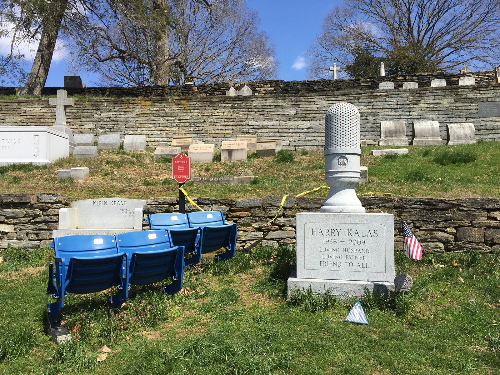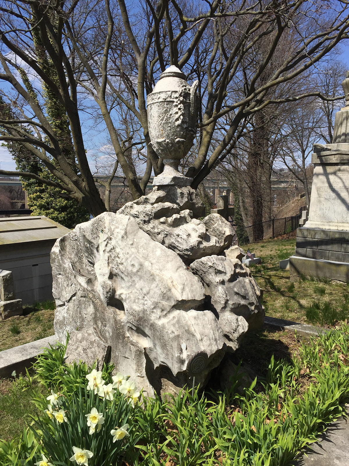 Next, we walk towards the Schuylkill where recent monuments overlook the river on terraced hills retained by the walls of sumptuous mausoleums. Symbolism in contemporary monument design is arguably less poetic as it was in the Victorian era, having evolved from references of religion and renewed hope, to a more literal and individual translation of one’s greatest contributions and passions. The monument of Phillies sportscaster, Harry Kalas, is perhaps the epitome of this trend. Resting on a prime piece of real estate, Kalas’ grave is marked with a bulbous microphone-shaped sculpture, sod from Citizens Bank Park (where the Phillies won the ’08 World Series), and folding stadium seating, awaiting visitors.