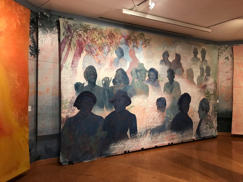 Báez’s paintings are atemporal in that they combine key Black female cultural figures from the past and present. We are offered a way to connect to these figures and their legacies through their writing, music, and teachings. But the magic that Báez creates is that she assembles her favorite key figures and presents them as a collective force, a treasure chest of sorts, as in the epic “To write fire until it is every breath” (2018), that features activist and educator Angela Davis five times at different scales and visual opacities. The scale of the work is important, and the transcriptions of letter excerpts meld with the portraits to reinforce the connections that Báez has uncovered and wishes to imply between these figures. This meeting of creative minds and culture-producers brings to mind the ethos of Judy Chicago’s famous “Dinner Party” sculptural installation with its combination of optimism and historical revision.