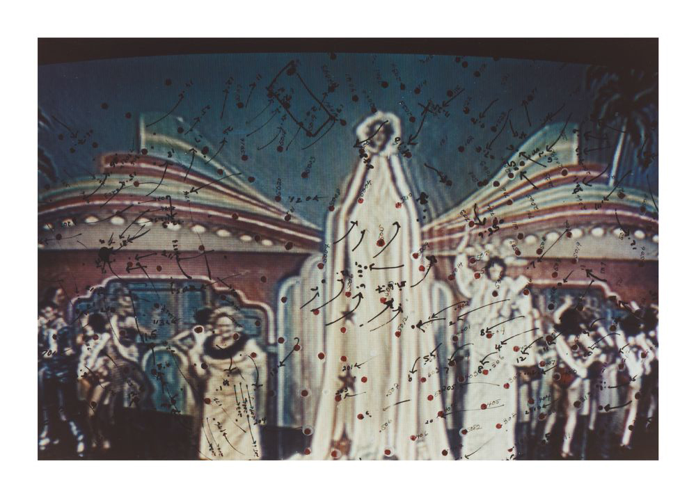 In the middle of the exhibition were a group of works that toggle between figuration and abstraction. With these “video drawings” Pindell once again invented her own technique: she drew arrows, numbers and dots on clear acetate which she fastened to her television’s picture tube, then photographed the televised image overlaid with her marks. The markings, which appear to be scientific studies, do not relate to the tv imagery in a systematic way, and yield no data. The fact that many of the video drawings record athletes certainly evokes sports statistics as well as the various physiological studies meant to maximize athletes’ performance. Pindell’s video drawings speak to the quantification of knowledge, our search for meaning through various analytic forms, and our attempt to create order within the inevitable, fortuitous aspects of our lives. The poor resolution from the cathode tube images resembles pixelated digital imagery and gives further emphasis to the mediated way we receive much of our information. They are criticism of the algorithm before the algorithm determined so much of our world.