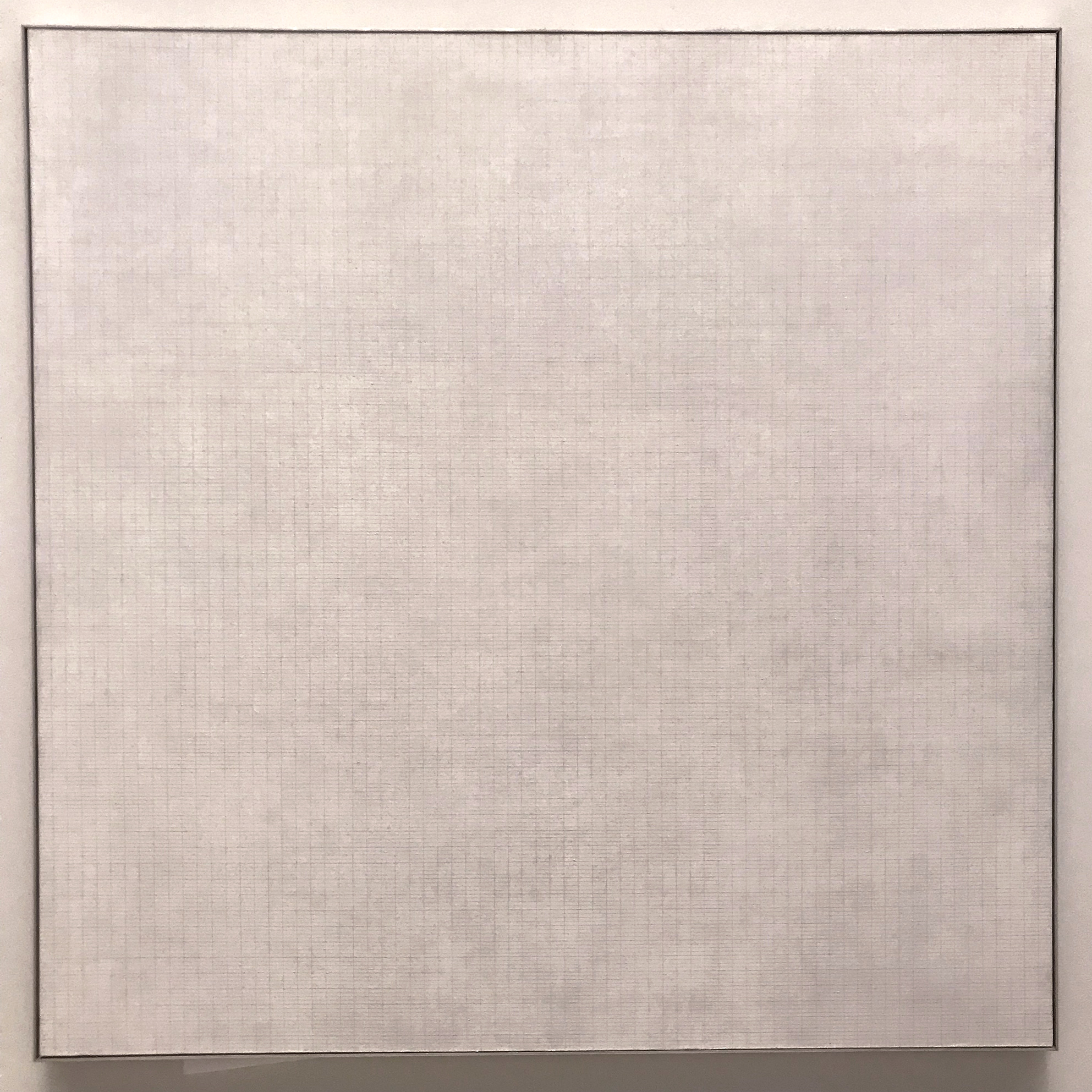 Martin’s Leaf—like all of her work—proposes a universe in which everything matters. The heaviness of one line, the way it trails off as it gutters into the periphery; the way it tracks the weave of the canvas and then doesn’t; the bristle of the canvas when a nub protrudes, enveloped by paint and encompassed into the art, still it gives the piece a near-microscopic third dimension, saving the grid from mere abstraction, making it real. The process of coming into that world, and coming to know it, is a process of coming to know ourselves—not our thinking selves but the seething, craving, knowing of our un-intellectual perceiving spirits—along with the “thoughtful” obstacles that our minds throw up to screen against our pure perceiving.