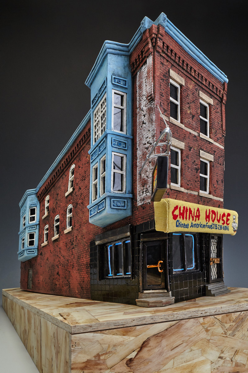 An immediate highlight of the show is Carly Slade’s eye-catching 2046 W Diamond Street, which occupies the center of one of the show’s two dedicated gallery spaces. Using ceramics and mixed media, Slade has constructed a miniature street corner in Philadelphia: an apartment complex with a Chinese restaurant on the street level, all rendered with illusionistic, precise detail. But what makes the work truly dynamic is Slade’s use of forced perspective. As you circle the work, it becomes apparent that Slade has compressed the building on one end and tilted the top of the base at an angle, creating an unsteady feeling that is only exacerbated by the way the plinth (made of what appears to be reclaimed wood) is tilted in precisely the opposite direction. It’s as if the building is mid-backslide and attempting to hold on for dear life.