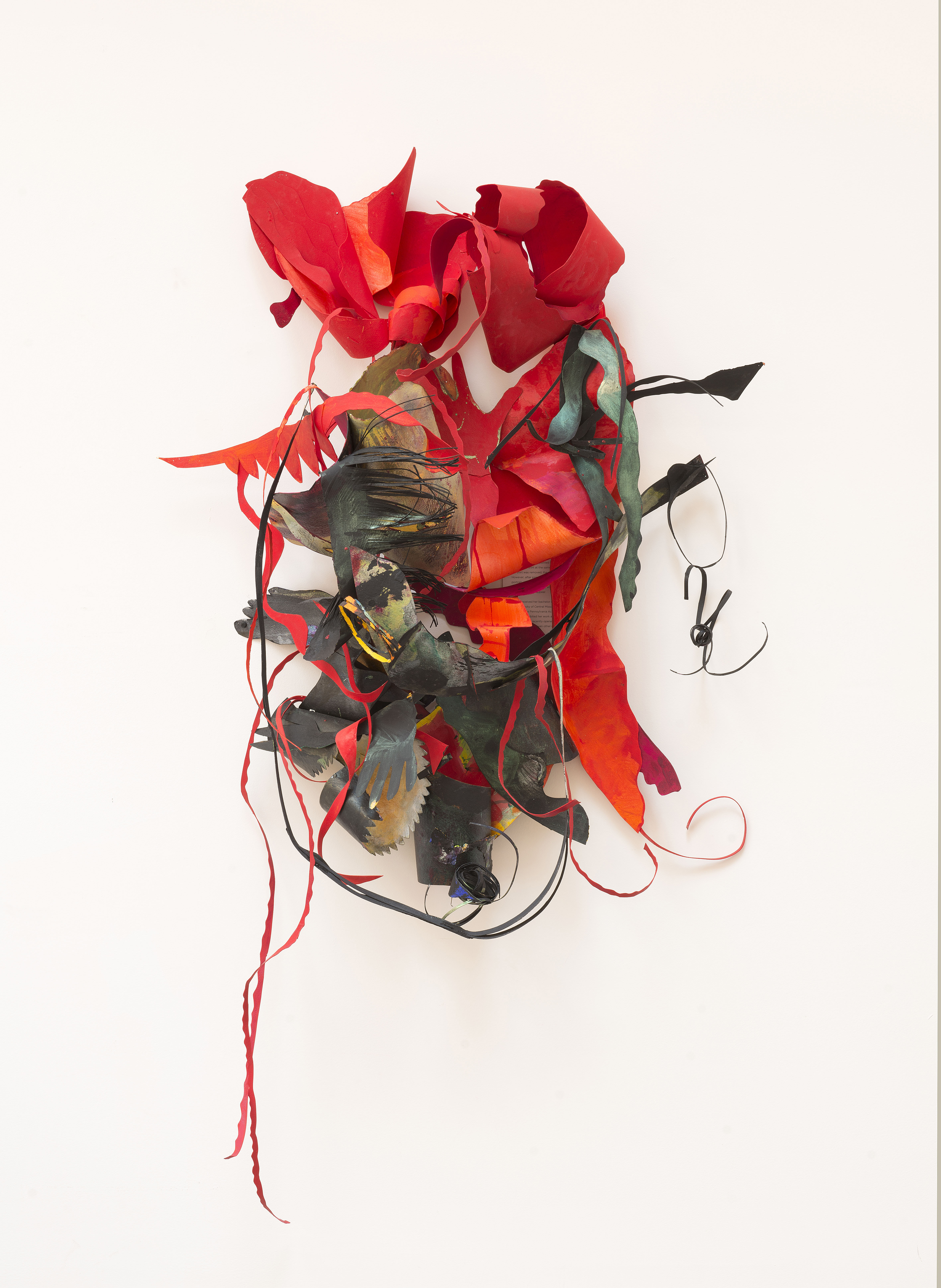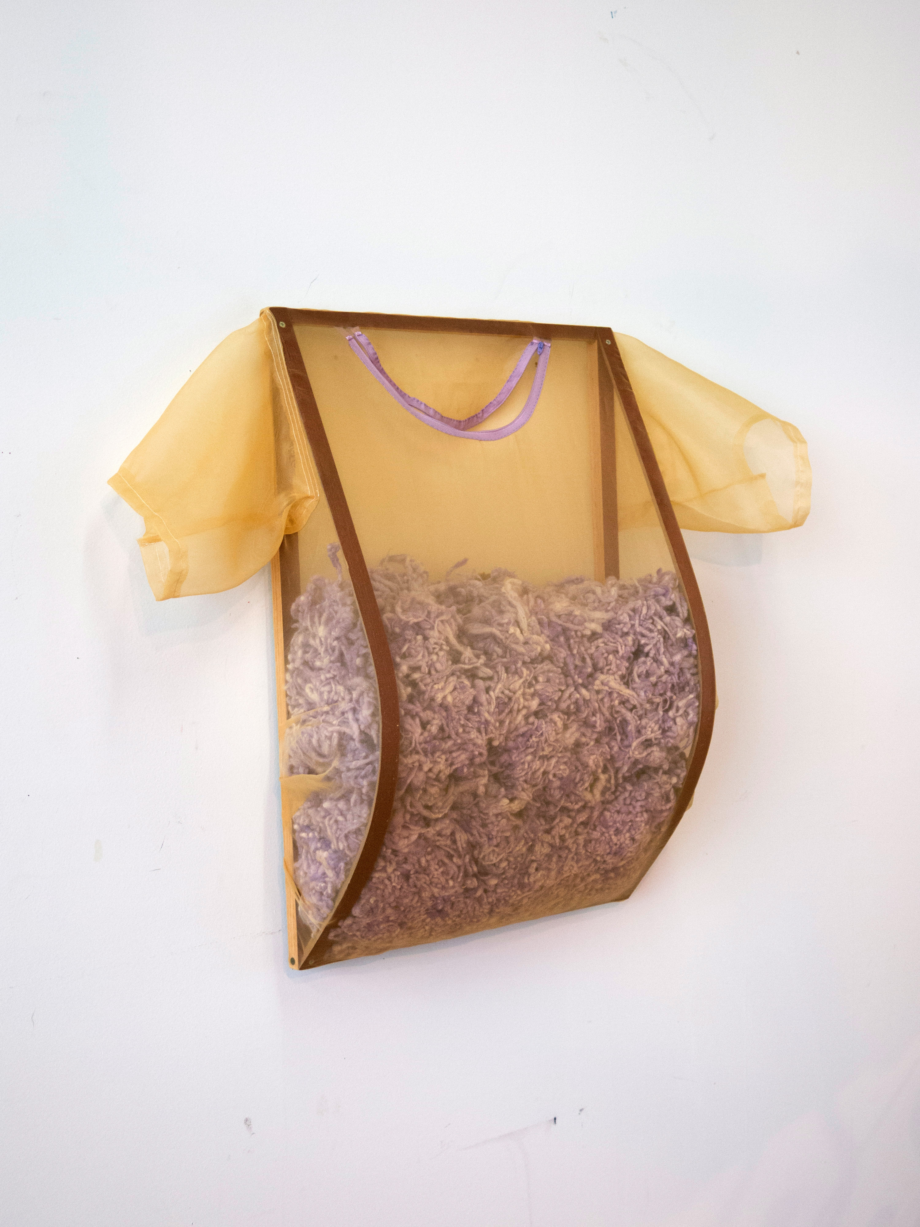 The exhibit also includes a powerful wall sculpture by thirty-something Anthony Bowers, “Half-Full,” a transparent t-shirt assemblage with protruding belly half-filled with wiggly cloth scraps, which shines a delicate light upon the expanding girth of middle-aged men in our culture of consumption.