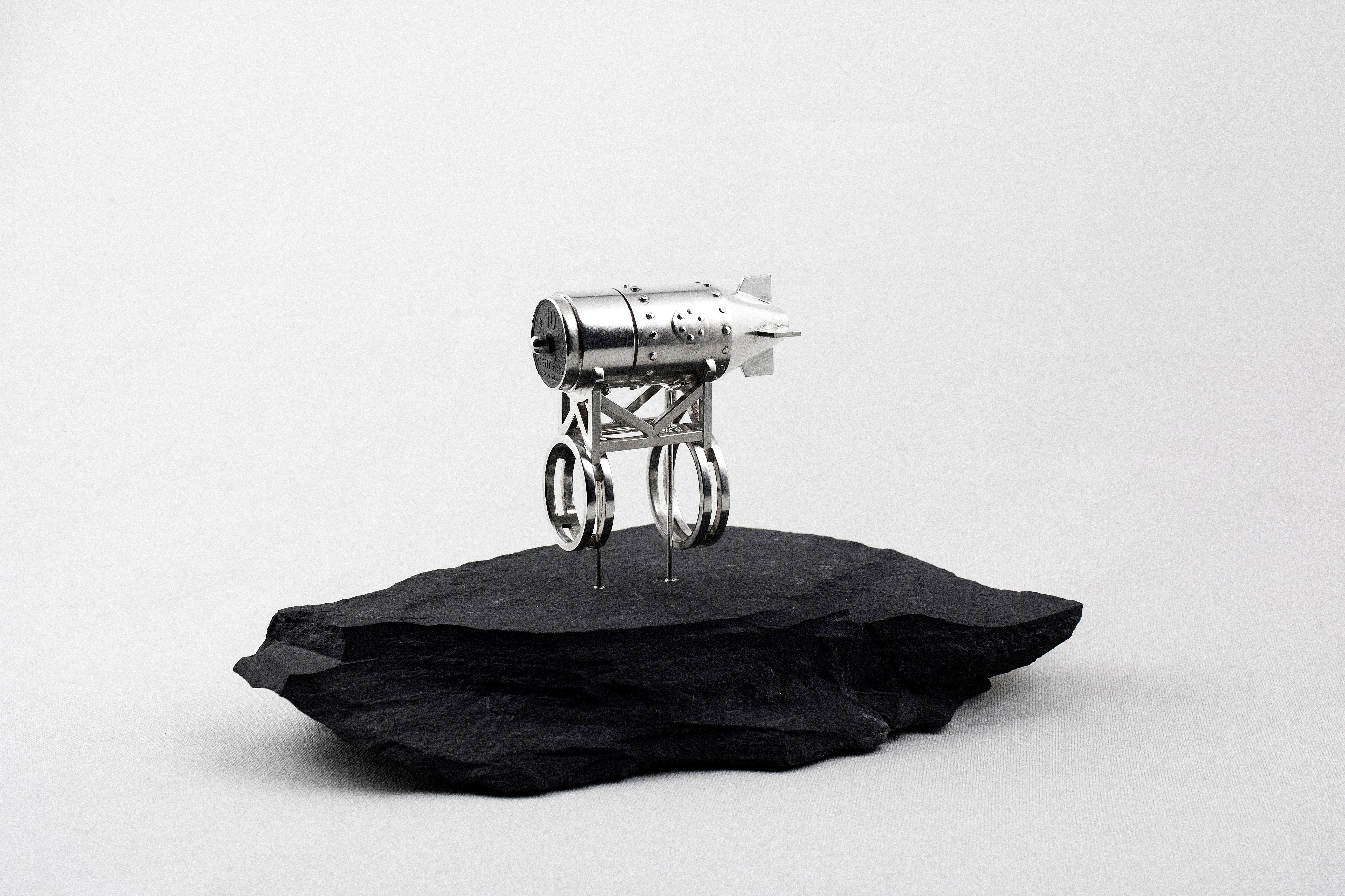 Ken Derengowski, born in 1974, a fabricator and goldsmith, has three large memorial rings in the Annual, constructed from sterling silver and found objects, which pay homage to art created by soldiers during World War II. The objects depicted by the rings are German mines, radar, and a torpedo, the means of destruction. Each ring is strange and idiosyncratic, masterfully done, and remind us of the terrors posed by war and the sometimes creative efforts of soldiers to survive and adjust to those terrors. Looking at these works made me think about the ubiquitous depersonalization of violence in modern media and video games, which, among other things, dehumanizes and thereby dishonors those on remote front lines, soldiers and civilians alike, who are trapped in the crosshairs of society’s conflicts. By the way, the U.S. Army has an art program. Who knew? Indeed, in 2010-11, the National Constitution Center put on an exhibition of work from that program, entitled Art of the American Soldier.