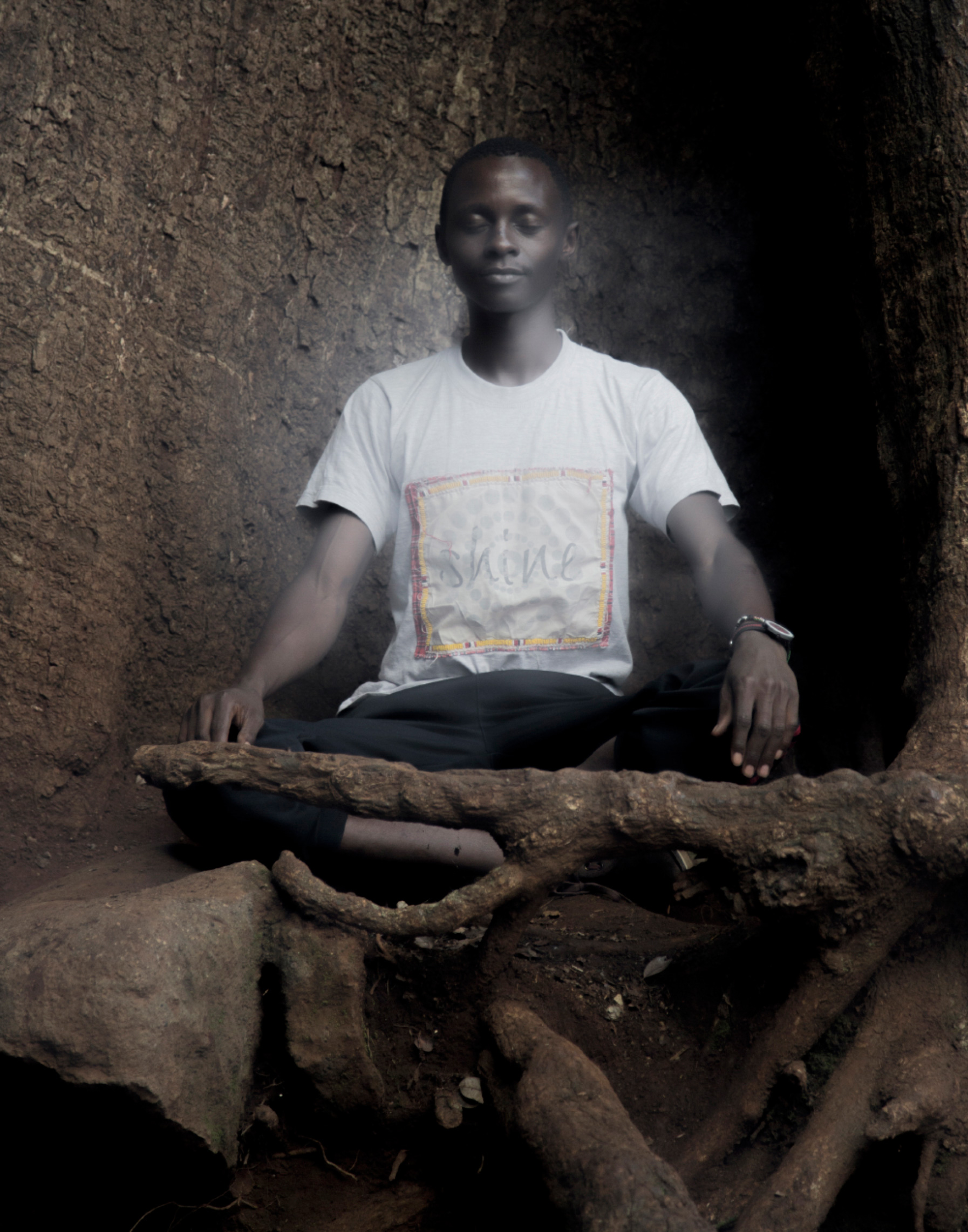 Bullock’s large wall piece sculpted out of cut, curled and colored paper evokes and eulogizes a violent encounter and spotlights the impossible dilemma of young black males in a stand-your-ground society. The piece contrasts sharply and beautifully with another work in the exhibition, Cheryl Tracy’s 2017 photograph, “Shine,” which captures the antithesis of the racist stereotype of the dangerous Black male predator – a young Black male, soft, spiritual, and peaceful, meditating, shining.