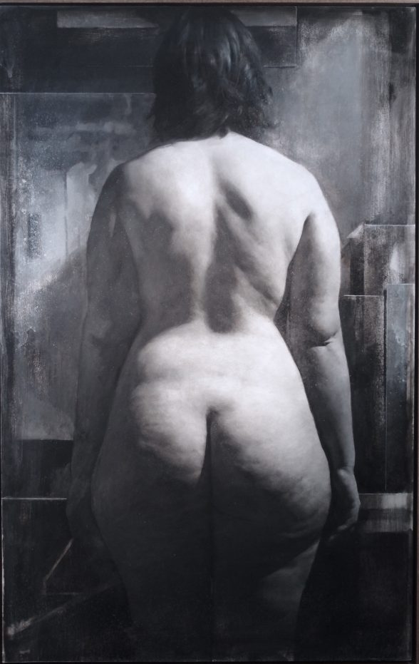 “Interior,” by Michael Grimaldi, an artist in his mid-forties, is a large, monochromatic drawing, which literally features the nude backside of a woman facing a wall. Of course, there’s nothing new about a painting of a nude woman’s back, particularly by a male artist – even Rubens did it – but the historical representations rarely are presented in shadows, or with the severity invoked by Grimaldi, or with the intention to reflect interiority. The piece almost stands as a rebuke to the ubiquity of male artists’ portrayal of female nudity, and it reflects the heavy burdens placed upon women in our society.