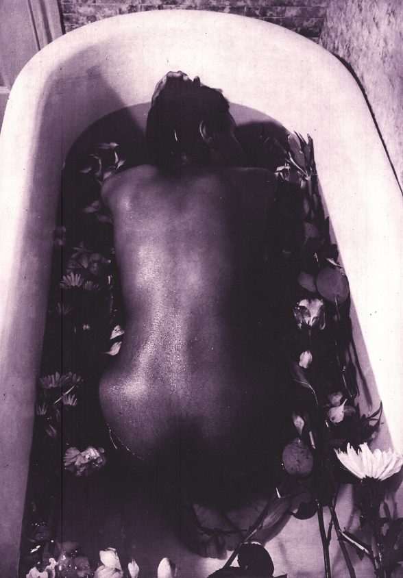In the large photograph, “Ophelia II,” Sophie Sanders, another artist in her mid-forties, presents a view from above of a woman in a bathtub filled with water and flowers. The piece was inspired, in part, by Sir John Millais’s Pre-Raphaelite painting “Ophelia.” The woman in Sanders’s piece is kneeling, and her back is to the viewer. The image is dark, but the pose is seraphic. The bathtub serves as the woman’s sanctuary. I thought of this work as the female equivalent of Cheryl Tracy’s “Shine,” referenced above. Two pieces which reveal a realm of peace and harmony which exists beneath the dark shadows that society too often casts upon people of color and upon women.