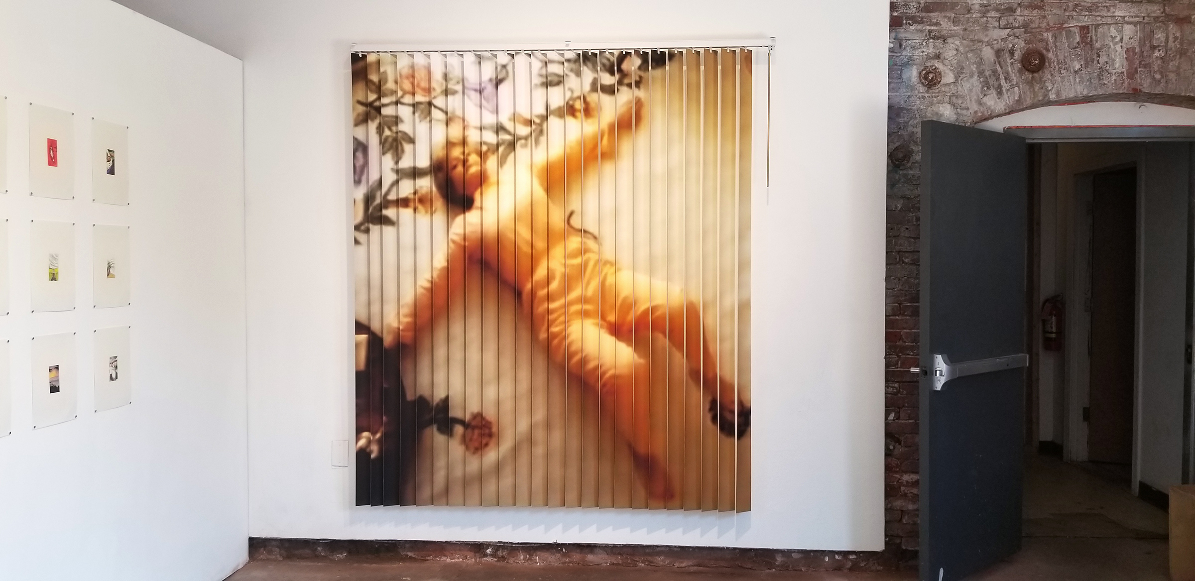 What may be surprising about Big Boys is that, well, the work is not extremely big. The works are not about dwarfing the viewer or the inflation of objects beyond their reasonable size. In fact, the pieces in the show tend to be very domestic is size and in content — chairs, blinds, tables, shelves. A sculpture by Brice Peterson exemplifies this quality: a set of blinds with printed surfaces that now hold an image of Angela Lansbury laying on the floor. Peterson explores a popular form of image making that combines online customization and media nostalgia. Household objects become shrines with the right sized printer.