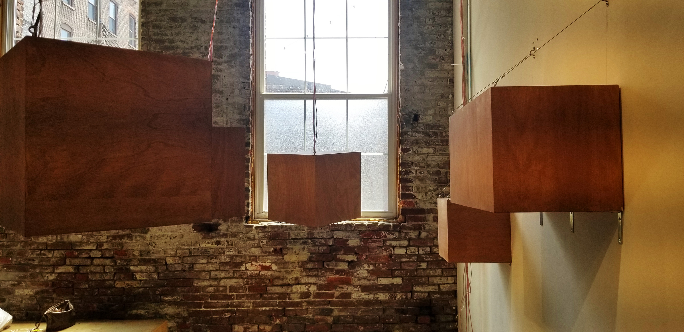 Dani Dobkins further pushes focused individualistic experiences by suspending five cubes with empty bottoms so viewers may stick their head inside of them and hear the various audio tracks of light percussion and chimes. Together the five cubes take up enough space for the viewer to weave between them and listen to the forest of sounds, but the value of the works comes from the singular, confining interactions.