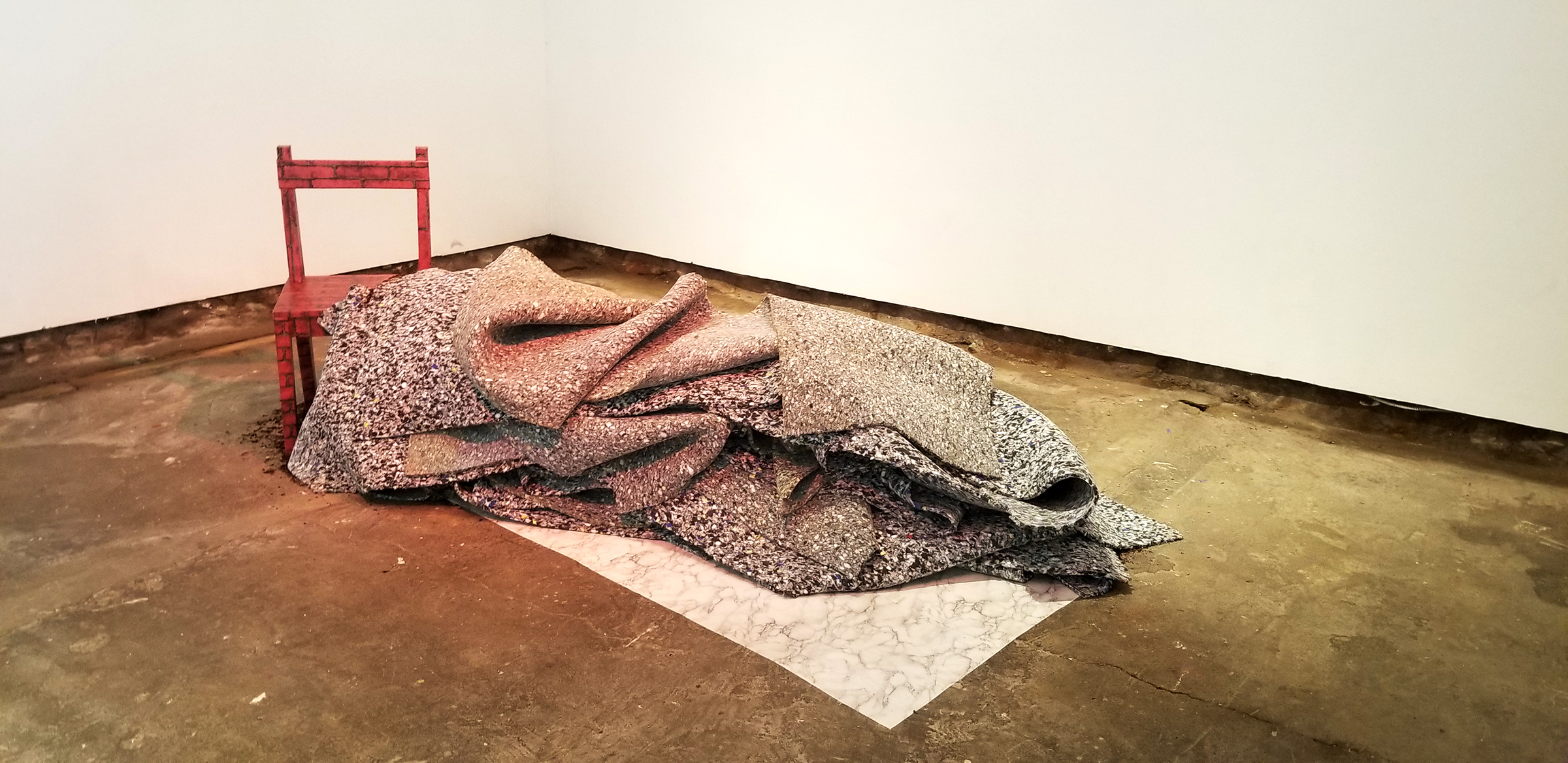 A sculpture by Mirra Goldfrad is composed of large folds of carpet padding sitting on top of vinyl floor tiles. The padding reaches and overlaps the corner of a chair that has brick patterning adhered to its surface and what looks like tobacco sprinkled on its seat. Goldfrad visually ties these objects together with a single pink light that washes the piece in a rosy tone. The resulting play of warm light and cool shadows brings beautiful visual cohesion to the work.