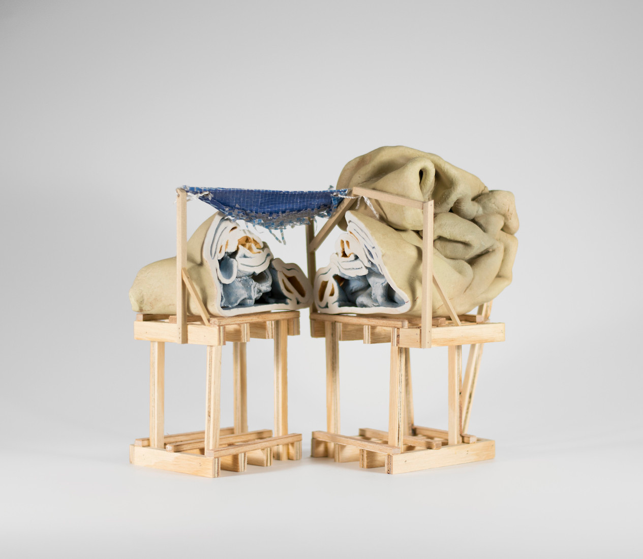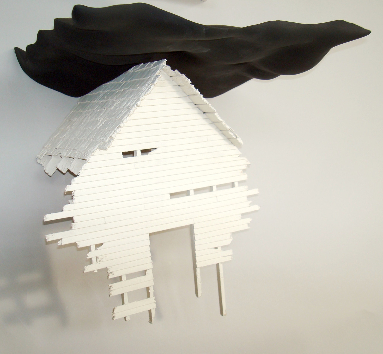 Right off the bat, Sara Allen Prigodich’s porcelain and wood constructions are so tactile and flesh-like that they evoke a morbid fascination, as if you’re looking at a cadaver. Piled into lumps on top of their wooden frames, they resemble empty rolls of skin, beginning to go gray and flabby. In particular, For Now, which positions the folds of flesh atop slender wooden stilts with all the solidity of cheap chopsticks, is breathtakingly creepy. If this work is about shelter, it’s surely about the idea of shelter being unsustainable, fragile.