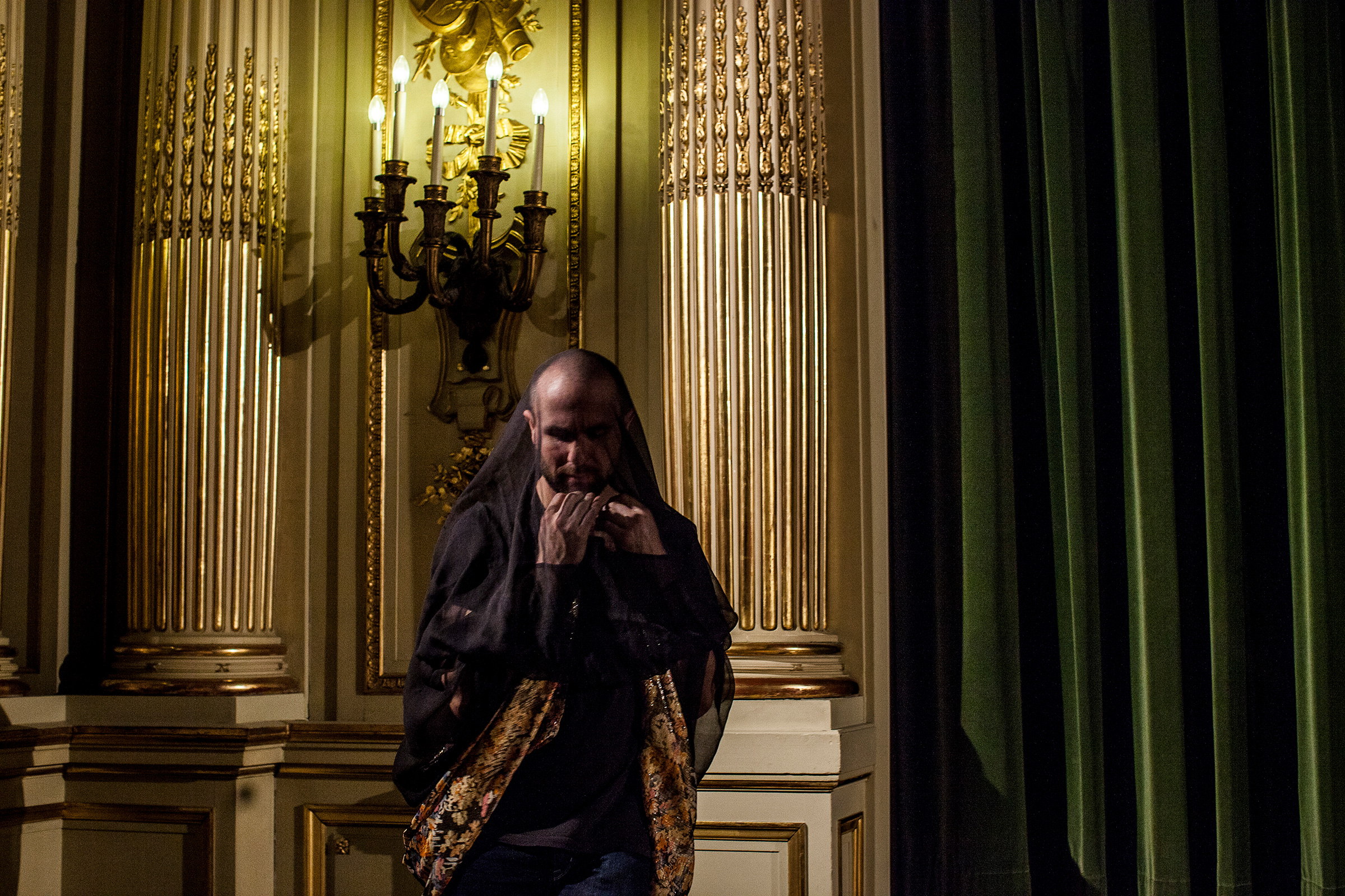 Spectators enter the space by crossing through the “backstage” area of the set, painted flats depicting a schematic casbah, which performers will later use to change costumes. As we traverse the porous boundary between the stage and the auditorium to take our seats, we are confronted with the text of the above-cited question, printed out in large letters and taped to the floor. Being reminded that moving from one side of a threshold to another is an experience that can be characterized as “liminal” is meant, I gather, to make us register the experience as a profound one. It is not.