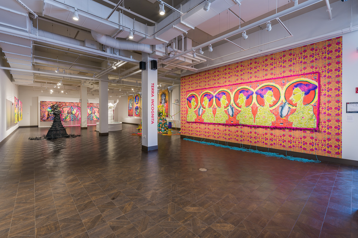 The first element you experience in Heather Ujiie’s Terra Incognita is not its neon-bright colors or its variety of textures, but rather, the sound of running water. Echoing in the high-ceilinged Art Gallery at Rowan University, this steady low hum is part of “The Goddess,” a white sculptural fountain placed in the center of the space, as if presiding over the technicolor splendor. Surrounding it, images of flora, fauna, humans and mythological beings all mingle in digitally-printed compositions that are both relentlessly cheerful and slightly on edge in their sheer dazzling brightness.