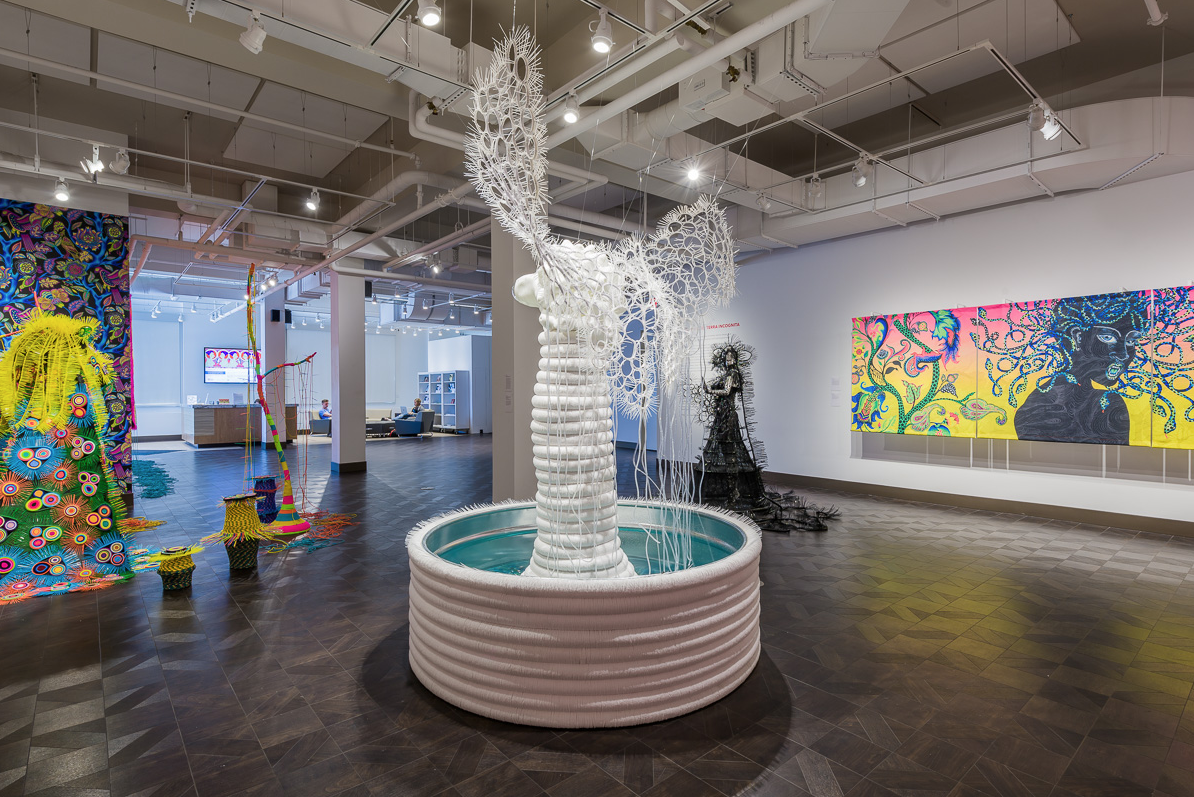 “Warrior,” a third sculptural work addressing the guises women have taken in myth and legend, fills up an entire corner of the gallery, its trippy-bright hues and plant stalk-like forms reminiscent of something out of a Doctor Seuss story. The strands of colorful rope that drip from its form are echoed in “Symbiosis,” a digital print that takes up the rear wall of the space. Here, cords spill forth from the flatness of the image and trail onto the floor.