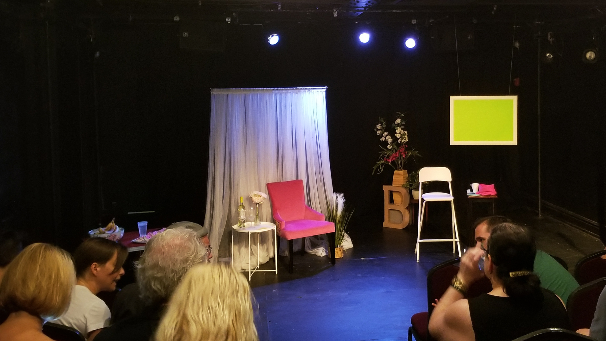 When I attended “White Feminist” at The Skinner Studio, a third-floor performance space at Plays and Players, I sat in the back row next to the entrance steps and placed my notebook against the banister while the room filled up with eager patrons. As seats ran out, a crew member placed two more chairs directly in front of me and said, “Sorry, we’re going to trap you in.” Now completely unable to exit and slightly exasperated I thought, well, depending on how the show goes, this might be a fitting anecdote to share.