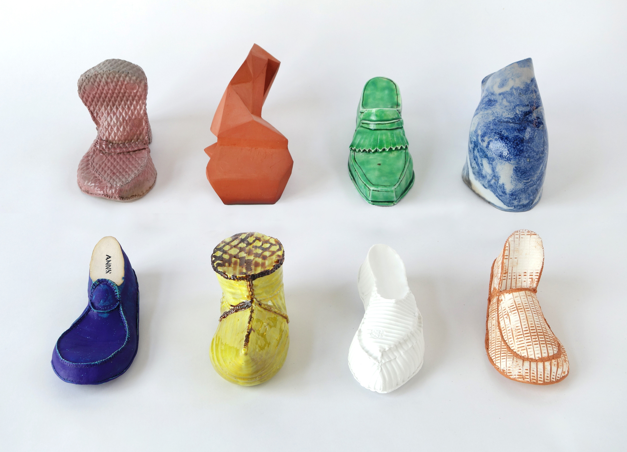 On the sublime end of the spectrum, there is a wonderful group of objects by Ann Agee in the show, pictured here, small, lovely clay shoes or slippers which actually are hand warmers, copies of 17th and 18th century Davanzati majolica hand warmers that were shaped like shoes and used by women in Florence who were trapped in their houses, perhaps making lace, in rooms decorated to resemble the outside world, because it was allegedly too dangerous for them to go outside. Foot binding in China, of course, comes to mind, where adornment and subjugation meet in stunted feet.
