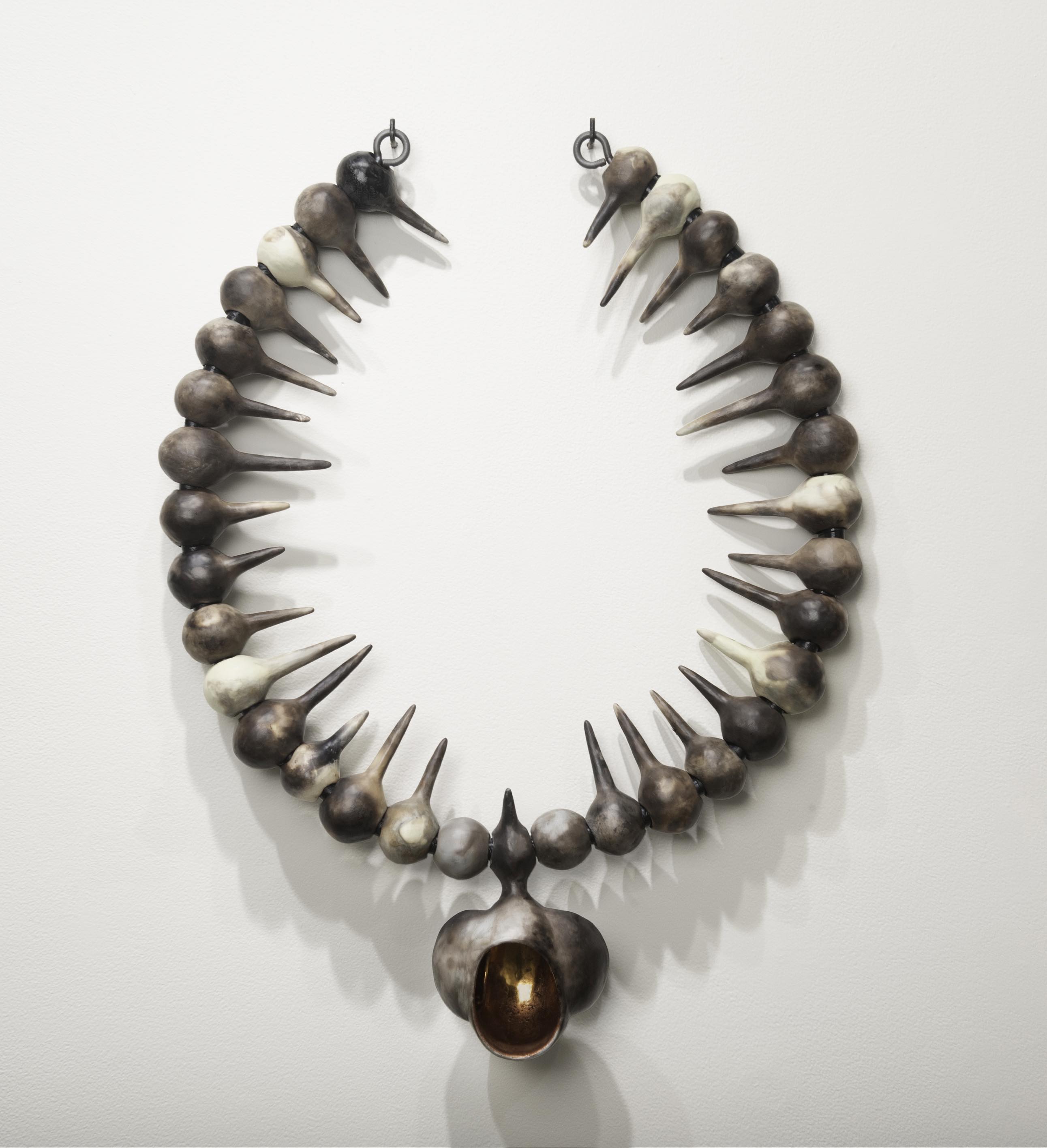 Sharif Bey is an artist who takes homemade literally. He works at home in order to allow himself to avoid institutional structures and workplaces, to spend more time with his family, and to reflect in his work the milieu in which he lives. His unique piece “Gold Bird #4,” in the form of a necklace, transcends traditional ceramic production and presents a striking combination of beauty and power. Its earthy, gourd-like components resemble rattles; they are sharp and soft at the same time; and its hearth-like pendant is a window into the world beyond.