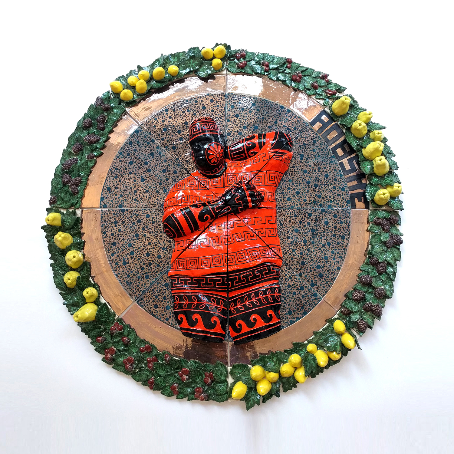 Roberto Lugo has two pieces in the exhibition. We’ve written a great deal about this remarkable artist, most recently about his contribution to the Taller Puertorriqueño homecoming show. The signature piece of “Making a Difference” may be his gorgeous plate “New Slaves: The Cycle Continues.” The title itself speaks volumes about the messages conveyed in his work, in which he intends “to honor people of color.” Beholding the figure that dominates this work, which invokes the patterns of an African heritage together with the orange jumpsuits of mass incarceration in the United States, you almost feel as if Lugo has magically condensed histories of oppression and identity and walked them into the present.
