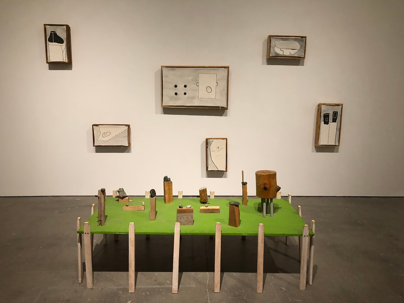 I visited Morton’s current retrospective at the ICA,The Plant That Heals May Also Poison, on a Saturday afternoon. Following the title piece, which appears first in the exhibition, are Morton’s earlier works and drawings. These consist mostly of simple shapes in earth-tones. The white room is adorned with off-white pages, shades of wood, and the muted colors of leaves and clay. Both Morton’s sculptures and her drawings in this section utilize a lot of open space. For example, the Newfoundland Drawings are a series of spare, pencil line drawings on large white paper, while Souvenir Piece includes six simple paintings installed several feet behind a sculpture of mostly wood.