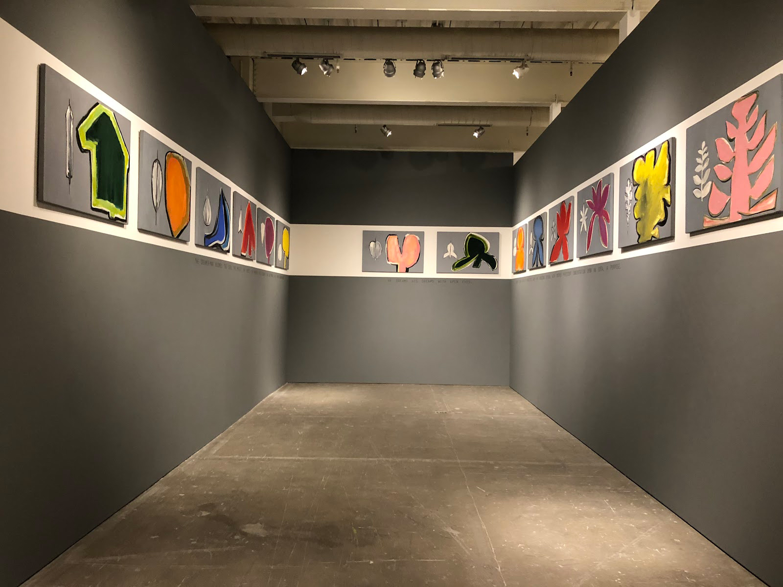 The final room of the gallery is dedicated to the installation Manipulations of the Organic, which features fourteen acrylic paintings created during the final year of Morton’s life. The fourteen paintings fuse, in a way, to create a single work. Each painting features a deep gray background, and a brightly colored subject. Some of these subjects resemble flowers while others are more abstract and harder to place. The panels are underlined by a passage that reads: