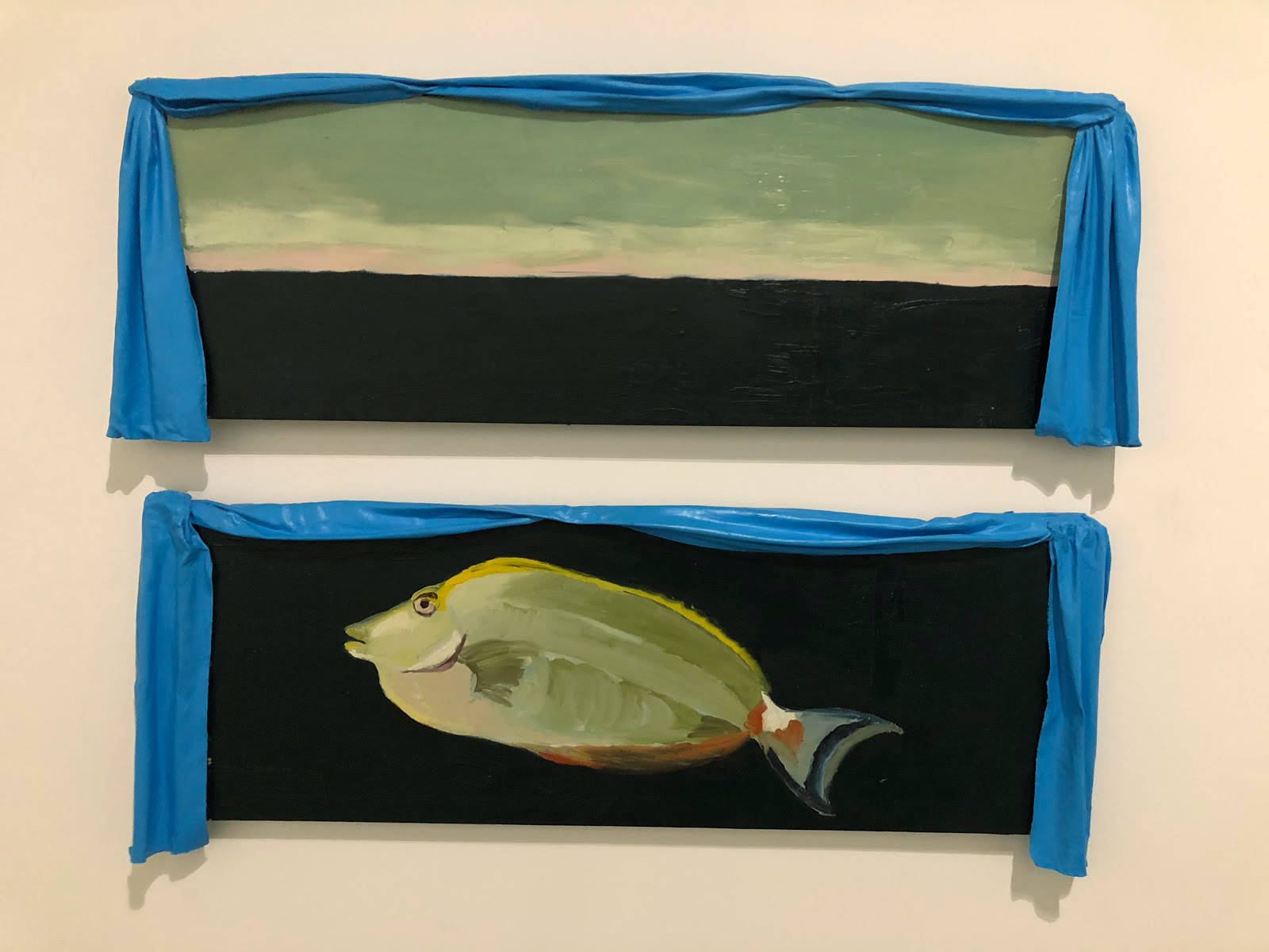 A nearby pair of small oil paintings, each framed by a blue curtain features a portrait of a fish below a seascape horizon. This work, entitled Regional Piece calls to mind Morton’s other nature-based drawings in the show, including Weeds of the Northeast, Yellow Clintonia, and the Newfoundland Drawings. Each emphasizes the relationship between earthly ecosystems and Morton’s creative process.