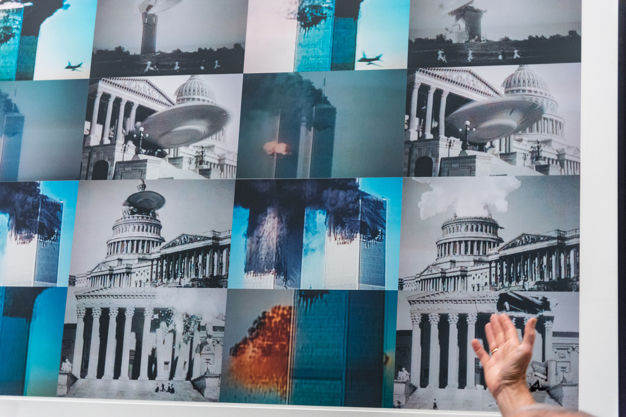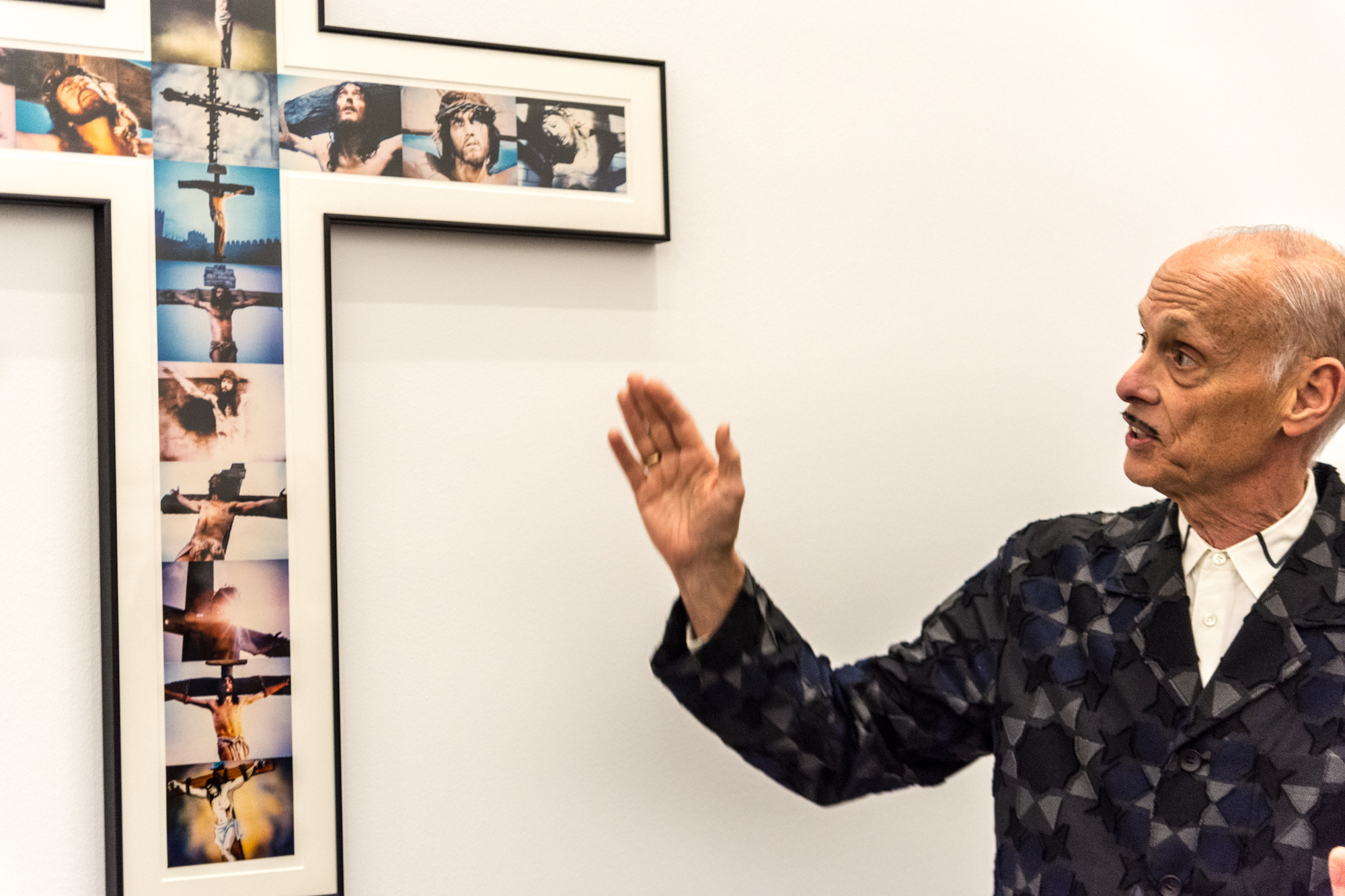 Discussing Movie Star Jesus, a photo collage in the shape of a cross composed entirely of depictions of the crucifixion of Christ from various Hollywood movies, Waters pointed out that the crucifixion scene invariably occurs about three-quarters of the way through a film, at about exactly the same time point that climax (both in terms of plot and physical action) is reached in porn films. In another piece that uses photographs shot of a television screen showing a video Waters made with Divine in the mid 1960’s re-enacting the Zapruder film of John Kennedy’s assassination, Waters explained that as the video aged and was photographed, it came to resemble the original Zapruder film ever more closely, but that Divine didn’t particularly like it, since “Divine didn’t want to be Jackie, he wanted to be Elizabeth Taylor. I wanted to be Jackie.”(Zapruder, 1995.)
