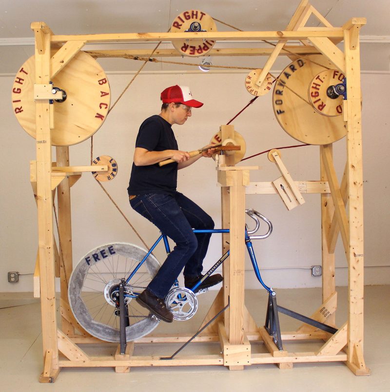 “Cycle for Self-determination,” a Rube Goldberg style pedal-powered lathe stands nearby.