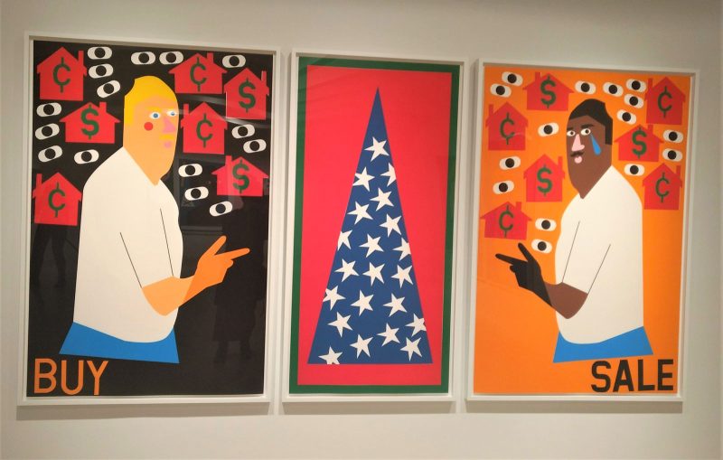 In a striking triptych, Abney illustrates the tension between a white buyer (labeled “BUY”) and a distraught black seller (labeled “SALE”). Both figures are surrounded by red houses marked with green dollar and cent signs and a swarm of surveillant eyes. A blue tear drips down the black man’s cheek. A triangular blue flag decorated in white stars and planted on a red and green background is stationed between the two figures. Symbolic colors of both American and Pan African flags make for an uncomfortable interjection, and Abney is able to suggest historical disparities without being too overt. These men are dressed identically — in a white shirt and blue pants — yet only one of them is satisfied.