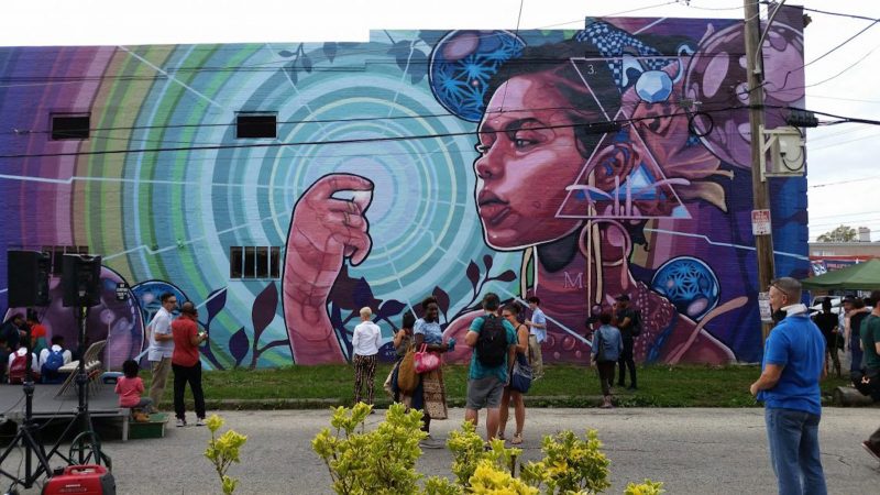 This event was the precursor to 2018’s Dreams, Diaspora and Destiny a mural project and collaboration between Mays and Britt. Located on the broad side of a massive building at the corner of 53rd & Media, Dreams… is bursting with color and energy. May’s use of flowering shapes and lines suggests dynamic movement around the image of a child with a bright light echoing out from her hand. As waves of light ripple out through the rest of the piece, the child appears to be holding the very spark of life itself between her fingers.