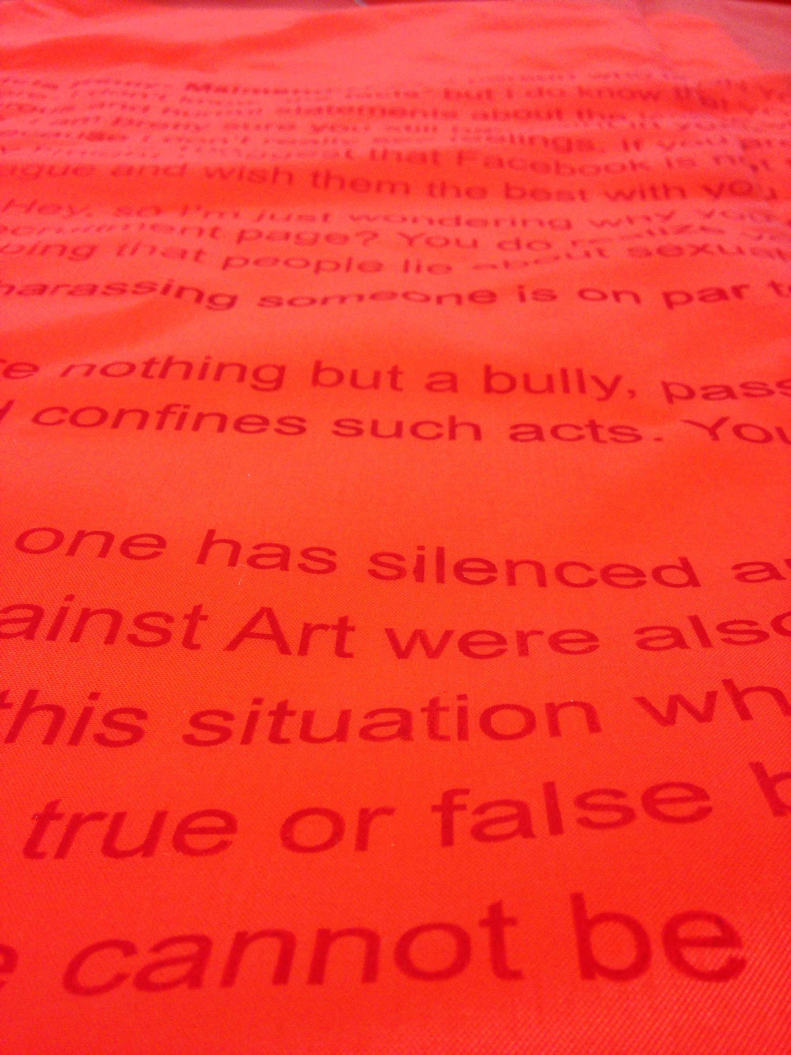 Standing out by its scale and by being non-figural, yet still very much about the body is Arthur Oak Padelsky’s “Red Flag” (2019), an overwhelming red banner, covered in almost illegible text, like a curtain shrouding the entire wall, this work signals alarm simply by its color. The alarm is real. Padelsky gives voice to all the red flagged horror found on the Internet and the red flags our own stories may raise for others.