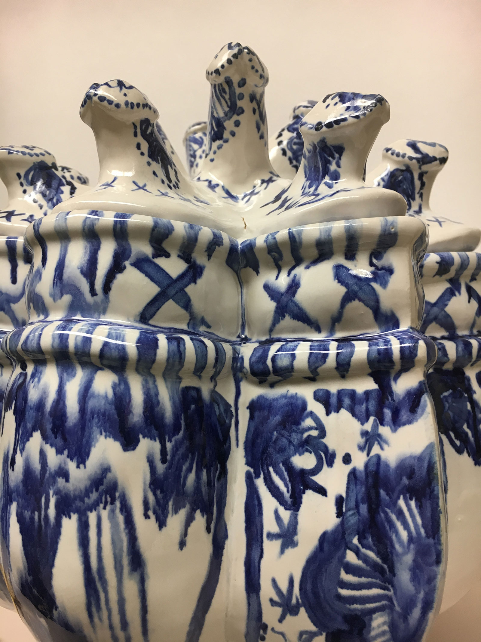 Despite being in an exhibition from a specific place, the works on view quickly assert the figure, the body, the person. The body recurs in nearly every work included, whether in the flesh toned elements in Emily Bayless’s “Trifling” (2019) or the repeated penises in her historically referenced “Toolipiere” (2019) Victoria Kue’s humorous take of female experience in textiles and in paint, or cemented in the horror-like story told in James Hollenbaugh’s black and white video “Toilet Tale” (2018).