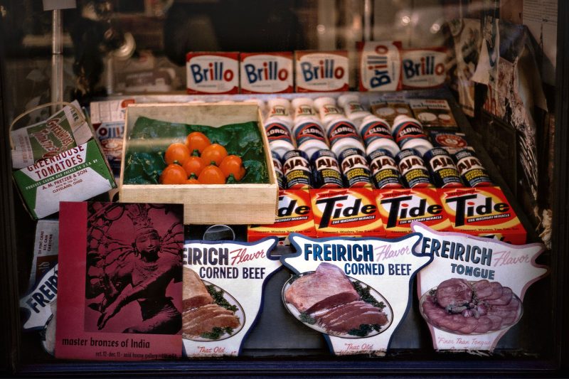 And occasionally, he lets color simply carry the image, as in a shot of a man rushing by carrying a blurring side of red beef, a picture that says “meat” with an emphasis that Tri-X couldn’t have delivered.