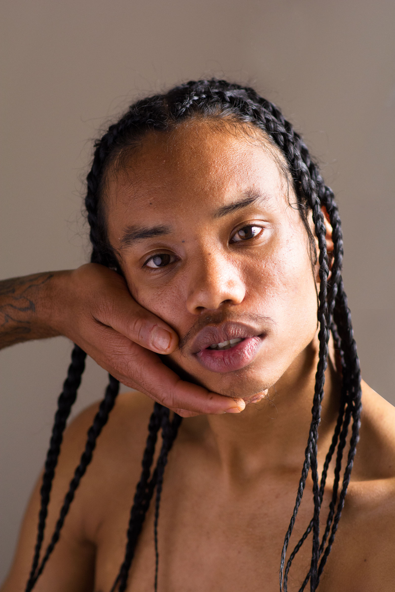 In contrast, “Danny,” a colorful digital photograph by Marcus Branch, offers an intimate glimpse of tenderness. The shot is a close-up of what appears to be a young man of color, showing him from the shoulders up. He’s bare-chested, and his head is slightly tilted, leaning into the hand reaching towards him from the left-hand side of the frame. The youth’s almond-shaped eyes, full lips, and wispy mustache contrast with the firm, rough hand touching his right cheek.