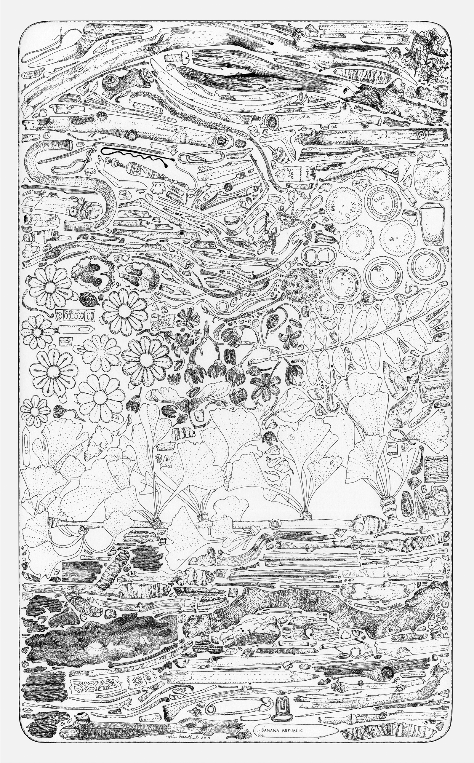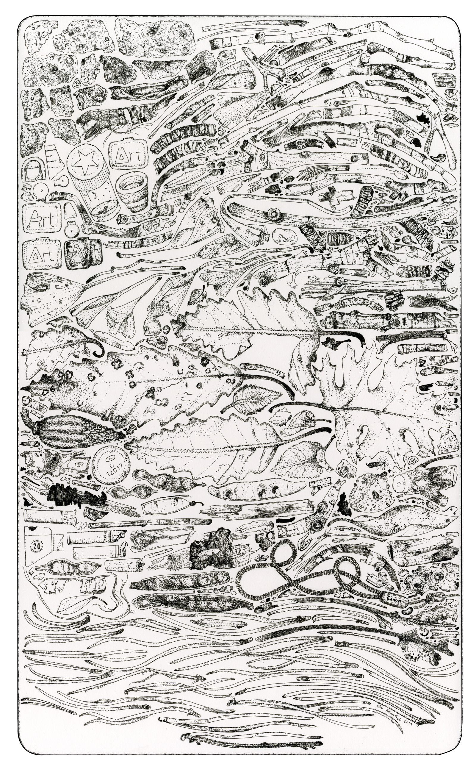 Everyone looks at the sky; many people use Google Images; some people enjoy cave paintings, but no one looks at the crap left on the ground. With the final three drawings, Rosenthal honors her home of Philadelphia, creating an orderly taxonomy of the things that no one looks at, devoting as much detail and attention to trash as to starry night skies.