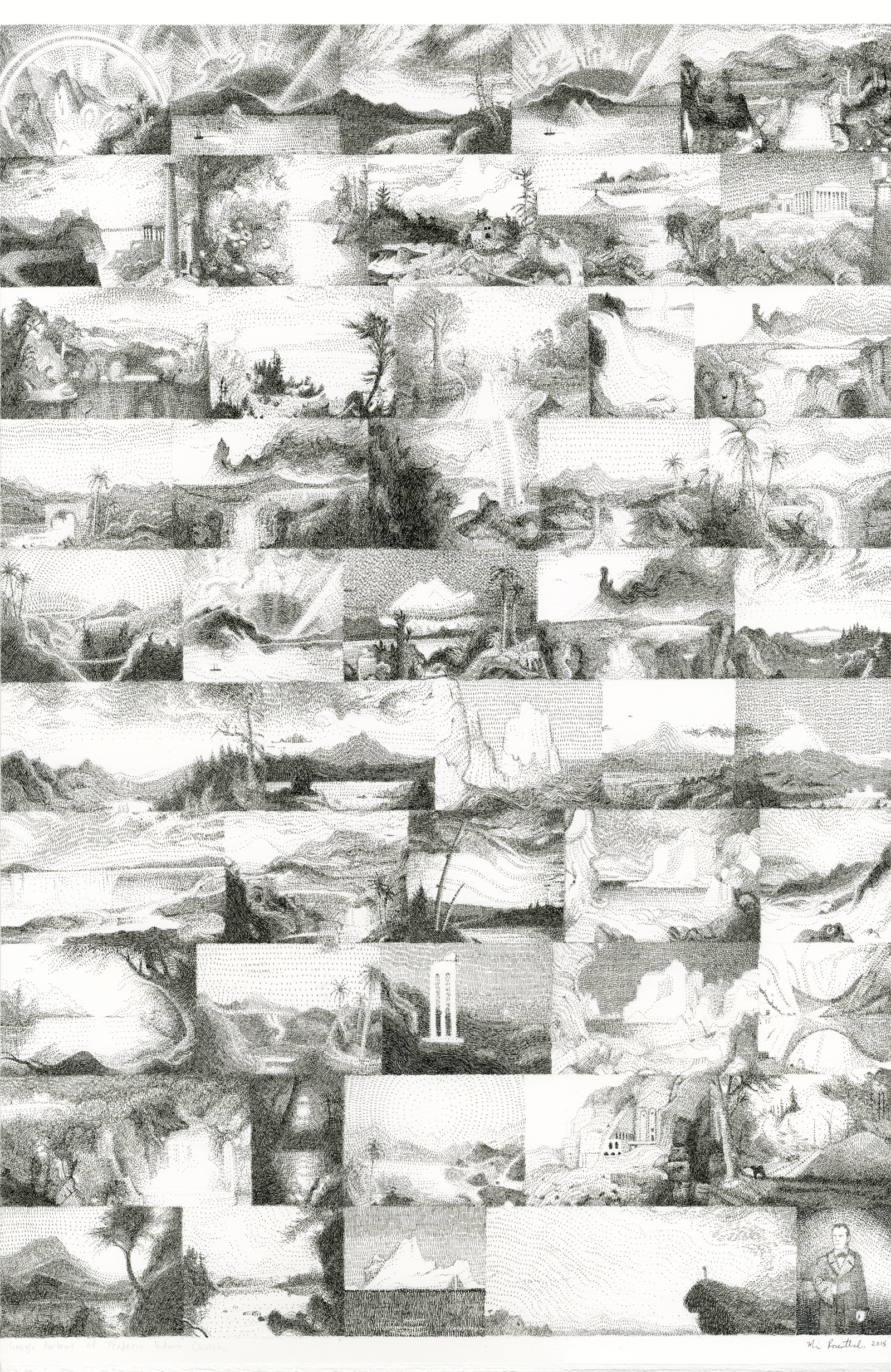 Pointing to our search for answers as a technological one, Rosenthal focuses on the human in “Google Portrait of Frederic Edwin Church.” The grid of thumbnail drawings presents Church’s famous landscape paintings as tiny adjacent squares and rectangles, all rendered in impossibly minute strokes of ink. While useful, few things look as banal as a page of search-engine image results, but Rosenthal makes them beautiful. Beside “Frederic Edwin Church” is a two-sectioned drawing, neatly divided in half left and right, but with both on the same sheet of paper. “Google Portrait: Paleolithic Cave Painting/Hubble Telescope” presents on the left the horses of the cave paintings of Lascaux as one small drawing after another in a crowded grid of search engine results. Paired with the overwhelming grid of cave painting thumbnails, the right side image of the sky seen through the Hubble Telescope is positively holistic and calming. Is the artist suggesting that you sacrifice the whole for an infinite number of parts, or, in other words, miss the forest for the trees?