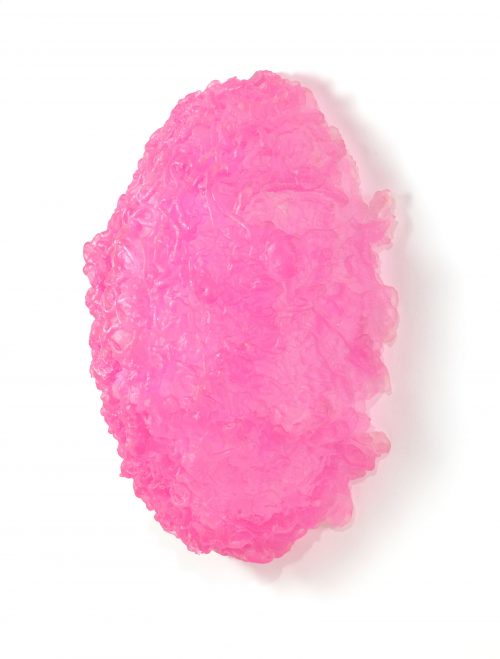At Locks Gallery, Lynda Benglis’s show Over Air, with an aura of a retrospective, features works made between 1984 and 2017. The a majority of the show is made up of the artist’s recent works, a series of paper and chicken wire dematerializations that are at times vexing and perplexing. The exhibition is laid out somewhat chronologically with “Pink Lady (for Asha)” (2013), one of a series of fountains (sans water), placed in the center. However, this work is upstaged, perhaps because it is non-functioning, by another work made of the same material. The hot pink, tinted polyurethane “Swinburne Egg 1” (2009) stands out for its eye-catching organic shape, textured surface and its artificial color. Hung like a beacon on the far wall of the gallery, as with many of Benglis’s works, “Swinburne Egg” is a metaphor for the what ideas bear in art. Here the reference is the English poet Algernon Charles Swinburne (1837-1909), known for writing on forbidden subjects, and who like Benglis, challenged the social mores of his time.