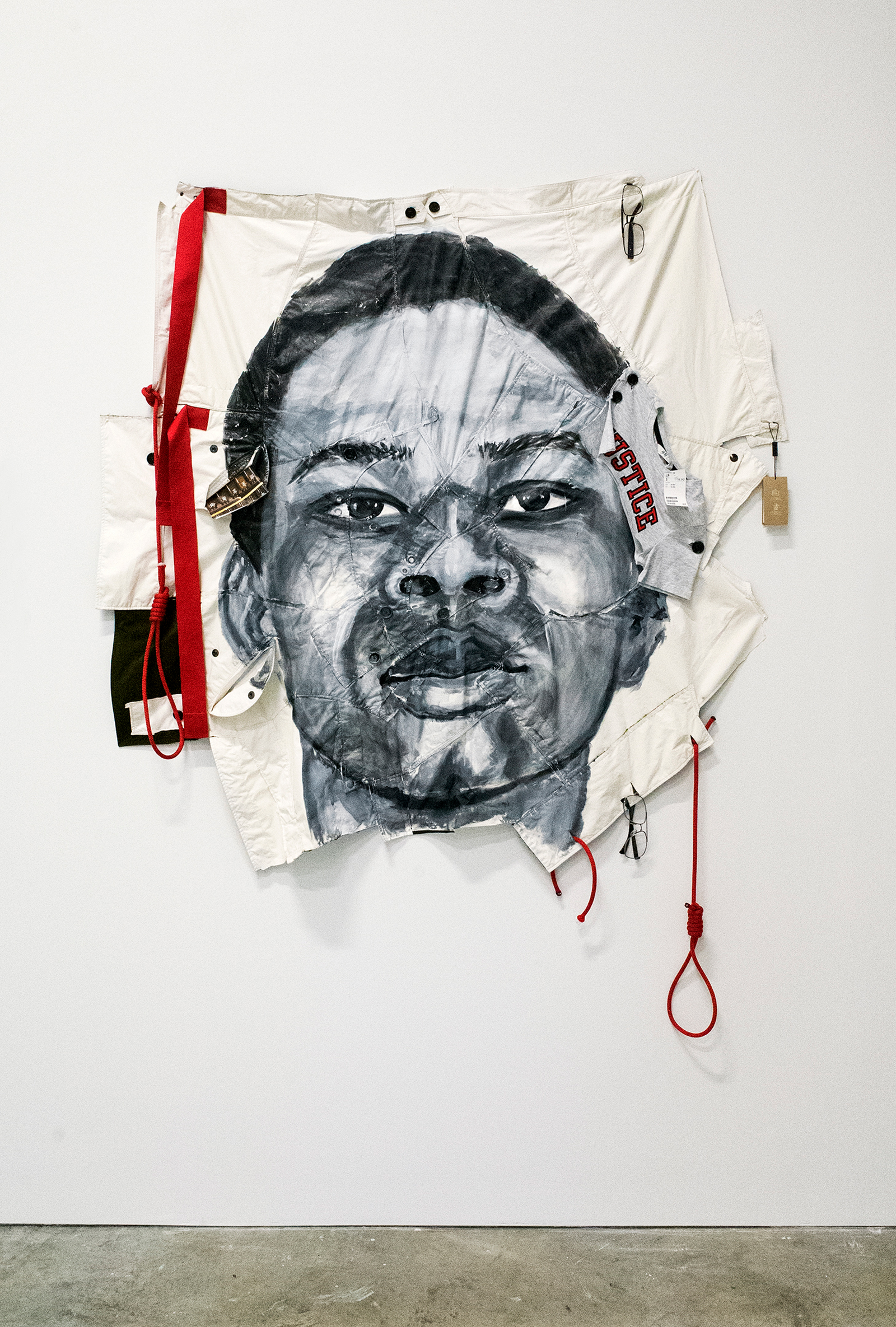 The gray-scale portrait of Michael Donald (a victim of lynching in 1981), titled “Mockery” and painted onto a fashionable tan jumpsuit, that references Burberry’s infamous hoodie with a noose makes an immediate, direct impression as it condemns tendencies of appropriating and decontextualizing props and hallmarks of oppression. Russell Craig, a returning citizen and self-taught artist and their mixed media “Mockery” links together lynching, the prison complex and high end fashion as institutions that endanger Black bodies.**