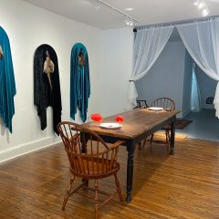 “Phantom Frequencies,” a visual-art installation and mini-opera by performance-artist Martha McDonald and composer and musician Laura Baird, activates the vast and boldly decorated entrance lobby of Wheaton Art Center’s Museum of American Glass in Millville, NJ. The piece, with blown glass plates and bell-jars dangling from ropes attached to armatures, sits atop the lobby’s plush red carpeting and serves as a gateway to Emanation 2019, the Center’s third biennial exhibition, up through December, 2019.