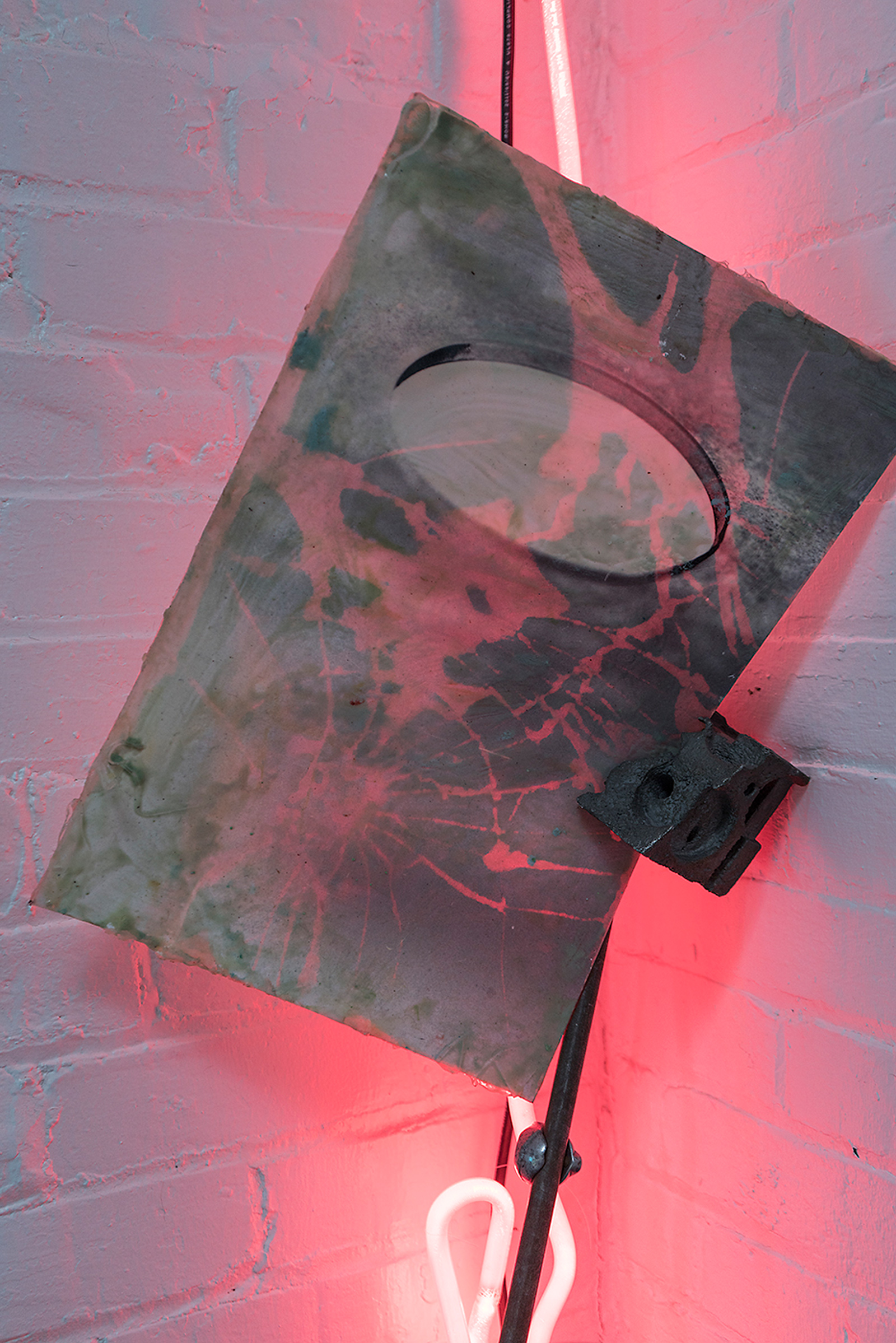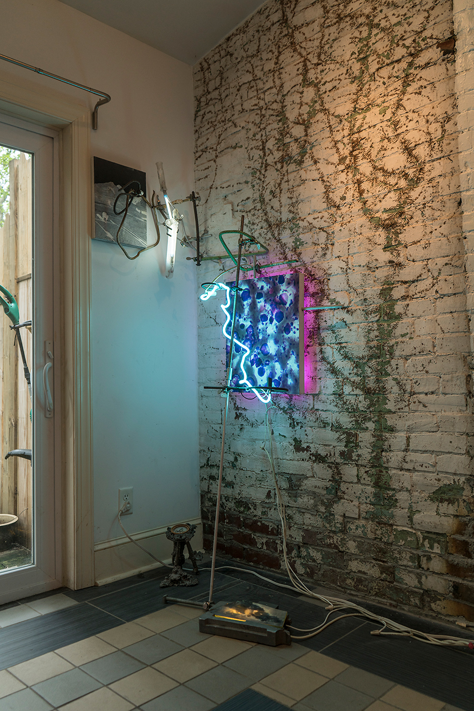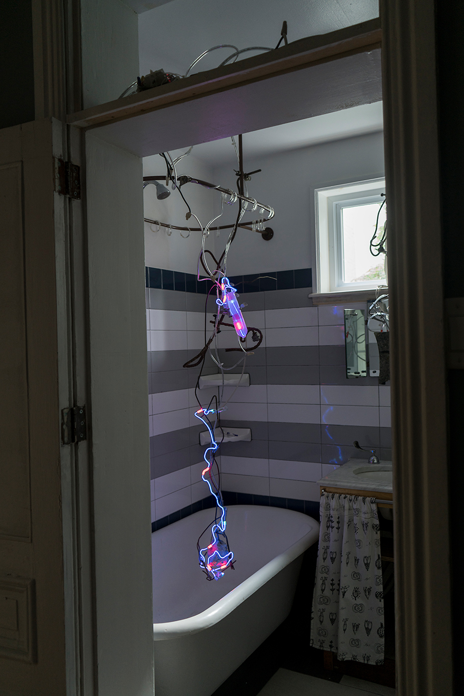 John Schlesinger’s work at Baring Street likewise connects with the history of mass-produced objects and with machine reveries. His sculptural creations occupy several rooms that resemble conventional exhibition locations and also spaces that are not (e.g. a bathroom, the front porch of the building, the basement). In each case, the work exists not simply as an object that might be seen anywhere, but as a site-specific installation that creates a kind of synergy with its immediate environment, picking up wittily on the immediate context–as in the bathtub neon that looks like water coming down from the shower head. These assemblages use found manufactured objects–laboratory glass, bronze and steel clamps, and especially salvaged rebar–as raw material, weaving them into a typically free form structure of neon lights. In many works, Schlesinger uses his own photographs of previous installations–encased in translucent amber resin–to add a two-dimensional plane to the composition; Schlesinger delights in the self-referential or “auto-cannibalistic” quality of these images, which look vaguely like X-Rays from Dr. Frankenstein’s failed medical office and seem to play at the boundary line between the organic and the mechanical. The shaped neon tubes–almost like drawn lines–are not only the driving force of these sculptures, but cast a colored light on the surrounding environment (brick wall, bathtub, corner space) that is integral to the piece. As site-specific as they seem, however, these “neon-hybrids,” as Schlesinger calls them, could theoretically adapt to other spaces.
