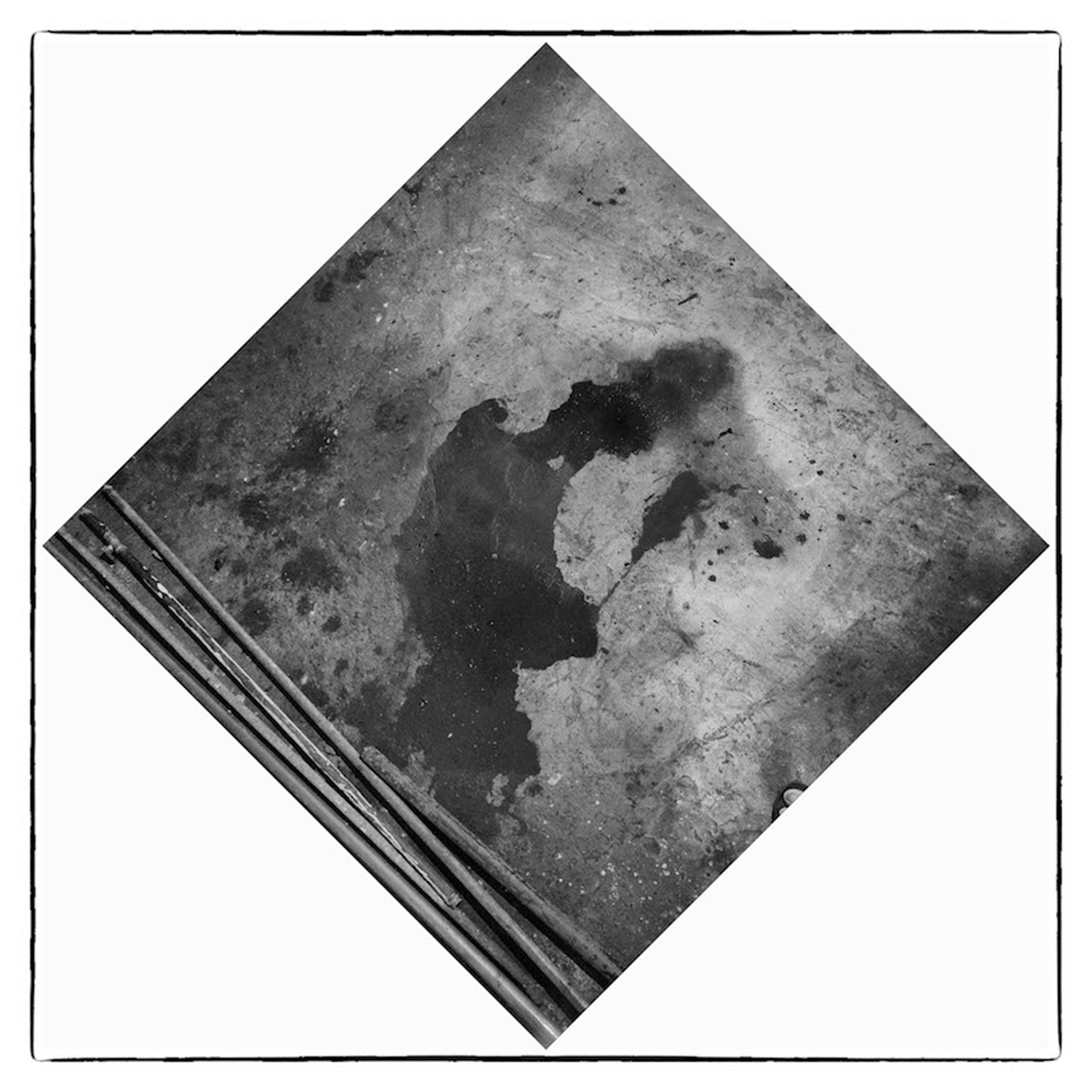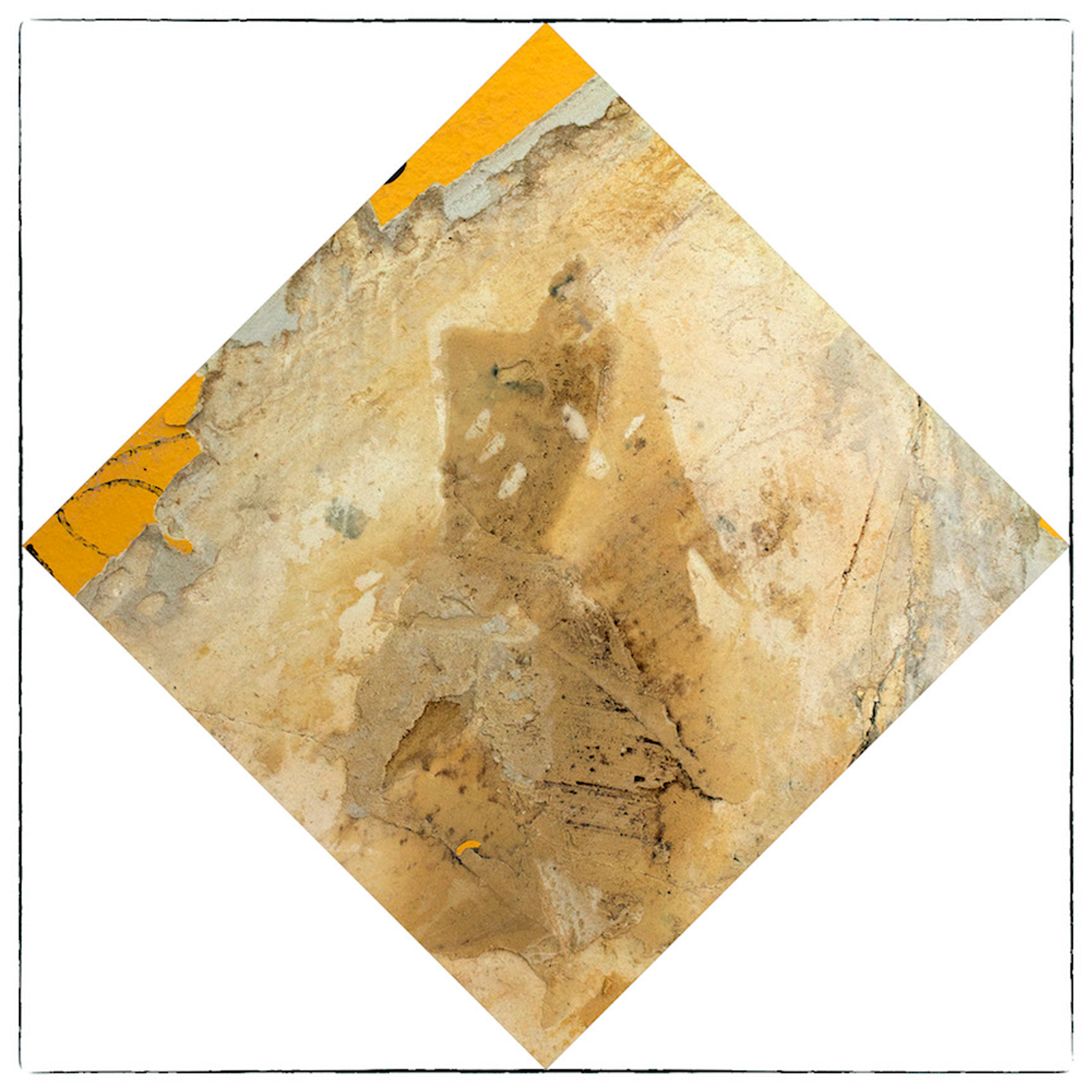 There is a thematic consistency to the series as well, for in creating these striking prints as aesthetic objects, Salzmann has taken materials that share the common quality of mass production and that bear the effects of wear, the rips and scars of outrageous fortune, the surface erosions and discolorations, that elevate them to the status of unique things. They are also singular evocations of a thought or mood or analogy or whimsy. (If there are two words that describe Salzmann’s imagination they are: methodical and whimsical.) The viewer looks at them and sees them as powerful abstractions, given shape and form by virtue of the photographer’s cropping; but we can’t resist seeing “real” forms in the shapes– a monk, a head of lettuce, a cape, a landscape at sunset, a murder scene by Weegee, an underwater sea bed.