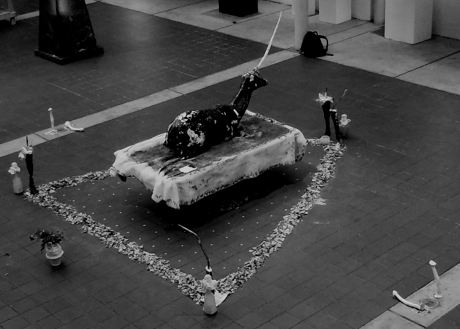 “Something about naming ritual and spiritual so clearly gets me caught up in things that barely serve the work or just get very boring, very quickly. However, my practice is built around utilizing my body as a vessel or passage point and harnessing an energy, a truth, to cast into space. Typically repetitions and replications of texts, movement patterns, and sounds are used for loading and casting. The images, wards, signals, beacons that appear are often used as secondary passages and keys that bring the energy closer to the space, ultimately allowing it to sit and deliver its mark and intention.”