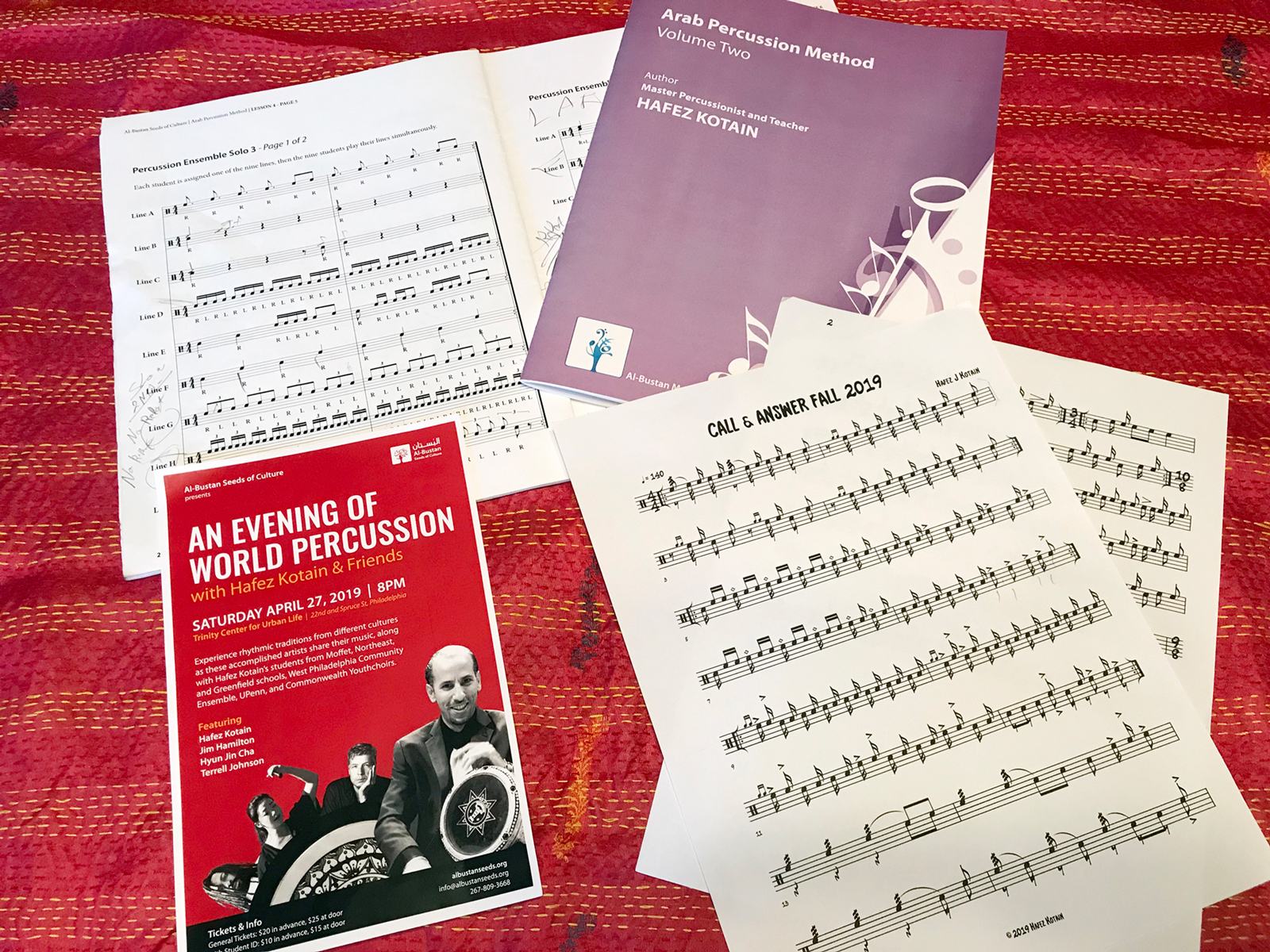 In this 30 minute episode of Artblog Radio, Roberta speaks with Pew fellow, percussionist, educator, and Percussion Director of “Al-Bustan Seeds of Culture,” Hafez Kotain. Kotain welcomes anybody and everybody (over the age of 5 years old) into his classroom. His mission is to teach about his culture, connect others through culture, and spread the joy of music! The musician was born in Venuzuela and moved to Syria with his mother and siblings when he was 4. He started playing drum when he was 7 and tells a very moving story about not being able to afford his first drum, but his sister saved up and bought it for him eventually.The interview, in which Hafez plays several of his drums to demonstrates their sounds and rhythms, took place at Al-Bustan Seeds of Culture.