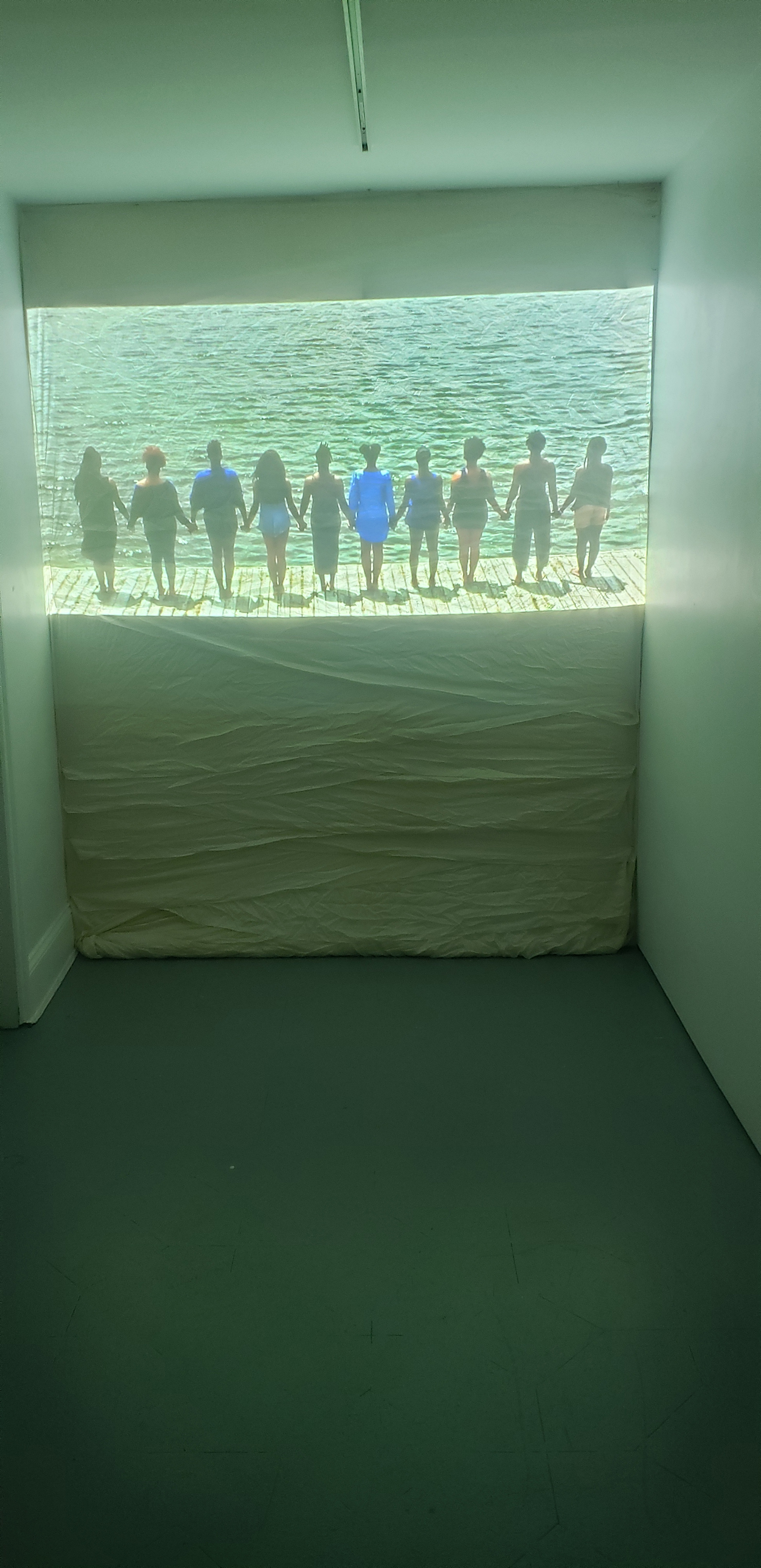 While not all of the work is as bright and beholden to a kind of reinvigorating Afrofuturism, the notion of empowerment and ritual is shared collectively by the majority of the works. Catherine Feliz’s “You Will Survive This Rape Trial” is a bound zine, itself left in stacks on an altar for the viewer’s perusal, as a means of combating trauma through digital, internet printouts and brave, celebratory writing. In the audio-visual room, Vitche Boule-Ra’s dark, minimalist soundscapes of percussive metal and incanting tape loops scratch their way over equally minimalist images. As the videos loop, those austere moments give way to the ghost-like, powerfully playful of Shanel Edwards work–dancing and videography that explodes into cosmic moments that feel like outtakes from Daughters of the Dust in their ability to capture both the surreality and joy-despite-struggle of Black diaspora. In the film, figures that move like water are often surrounded by it, facing it; a reminder of both the horrors and joys these natural, life-giving bodies represent.