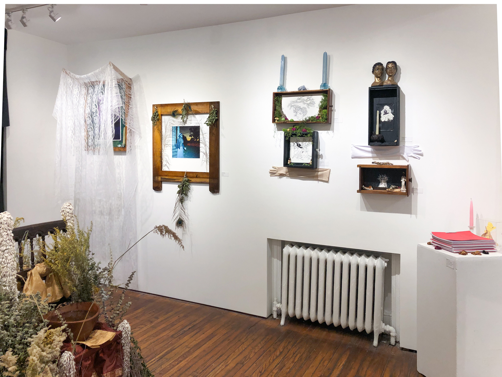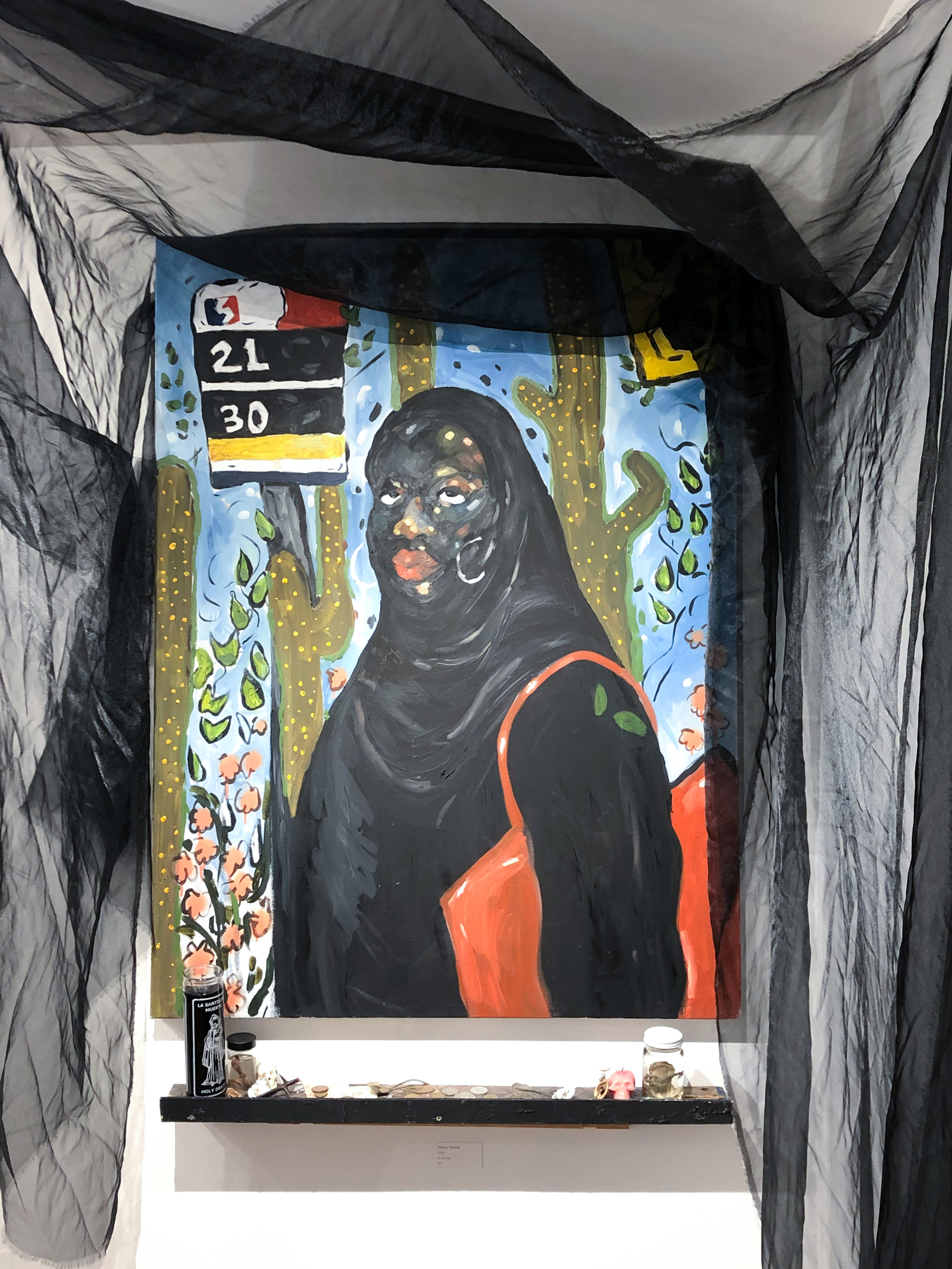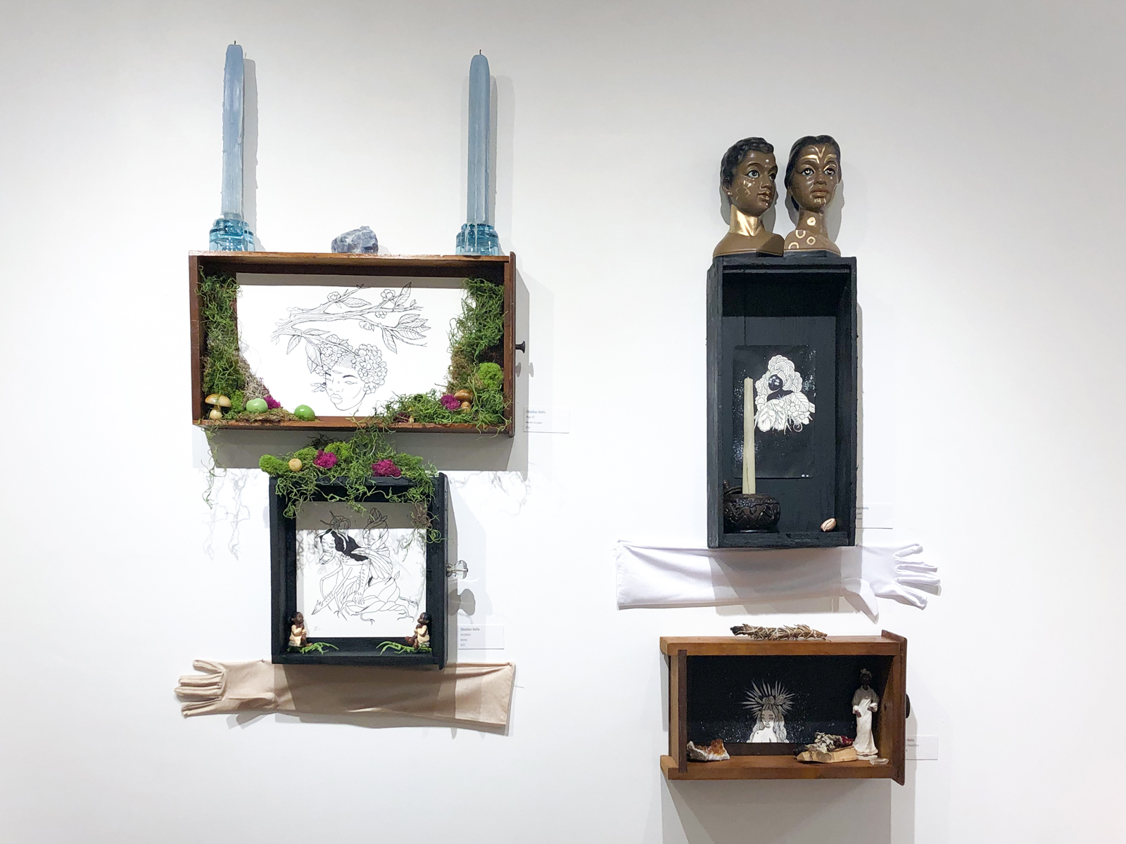 Alex Farr’s collages of feminine, black presences flanked by colorful ephemera and jeweled cut-outs shaped to look like traditional African attire are pieces that hover over altars adorned with candlewicks that spill over wooden planks and turned over jewel boxes that re-appropriate a grandmotherly spirituality. Alexander Newman’s eclectic worship space presents dreamlike photographs as elegiac altars that reshape Black masculinity. Here naturalistic forms of bodies perceived as Black and male aren’t so much rendered, their photos not so much developed–the subjects shimmer into existence, wrapped in golden, transparent shrouds.