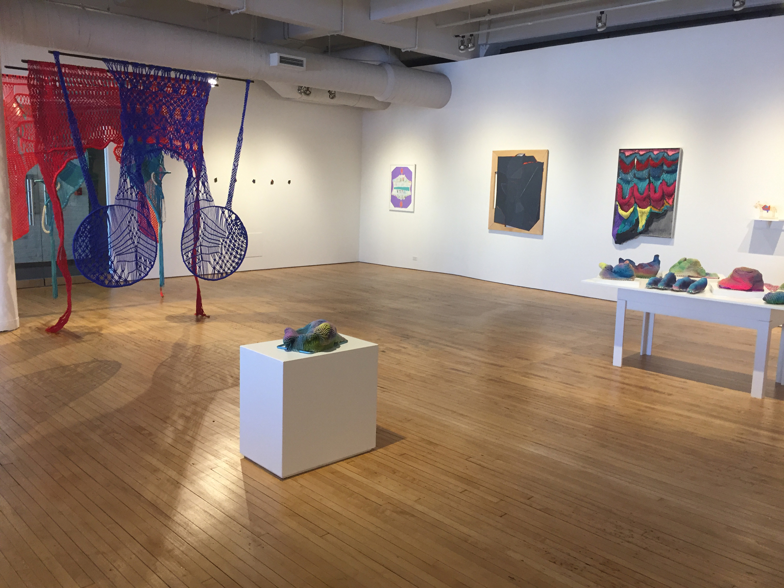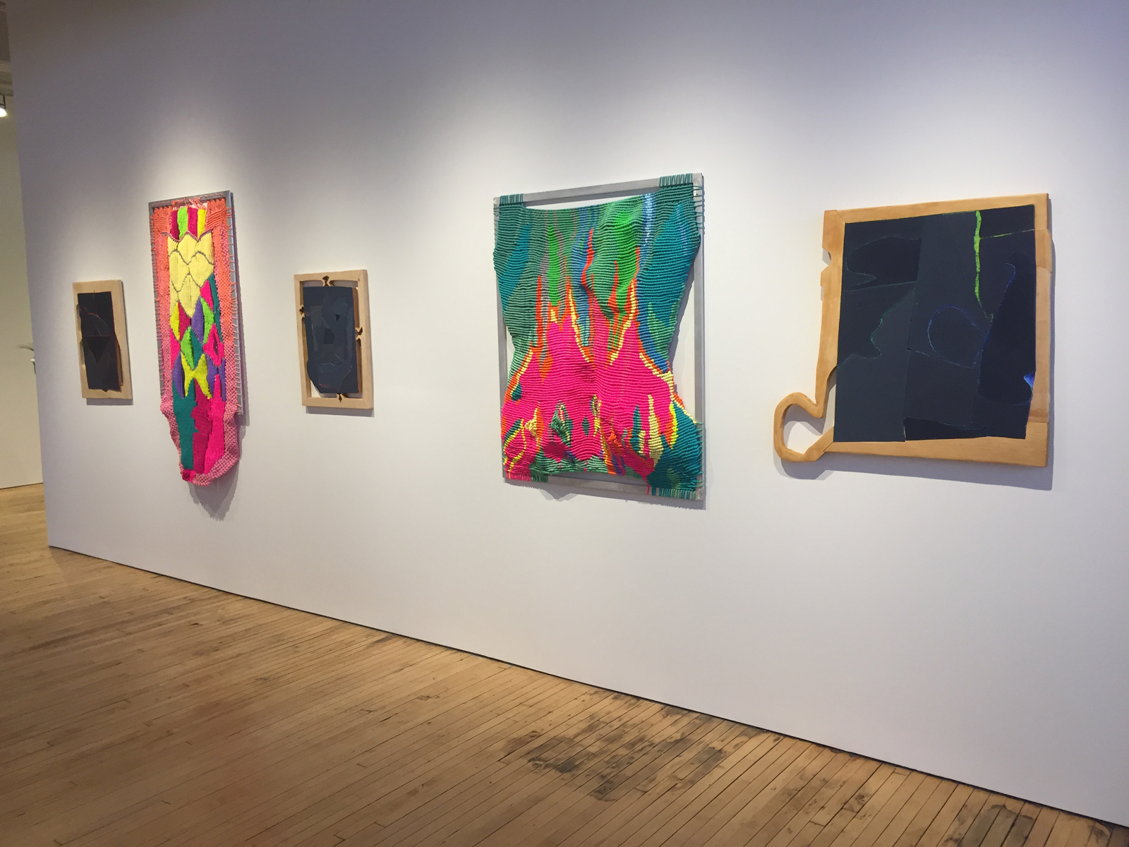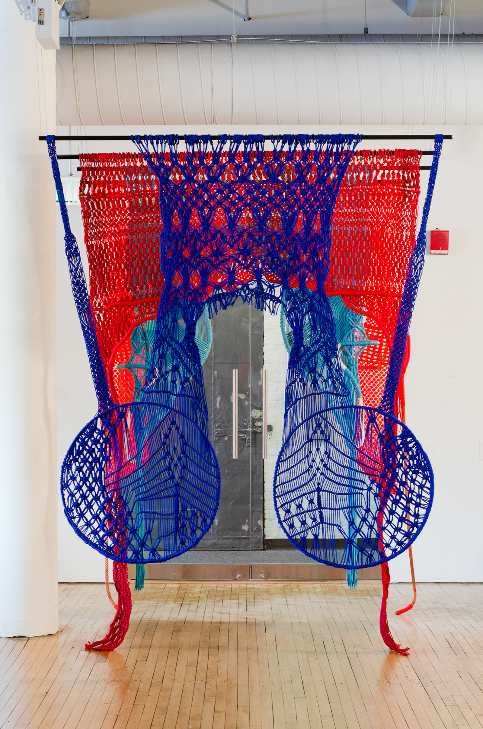The entrance to the show is marked by Jesse Harrod’s “Taught Tight Tender Sway”–a paracord and metal sculpture that hangs in layers from the ceiling. It acts as a gateway, a sort of birth canal, marking the liminal space between the colorful realm of the exhibition, and the outside world. This opening installation prepared me to experience the rest of the show. I continually found myself wanting to reach out and touch–to run my fingers along the woven and twisted textures found on walls, tables (namely, Jesse Harrod’s “Mons” series), and hanging from the ceiling. The materials and their bright colors made me feel like a kid in a candy store–face pressed right up against the glass case of delicacies, but unable to taste.