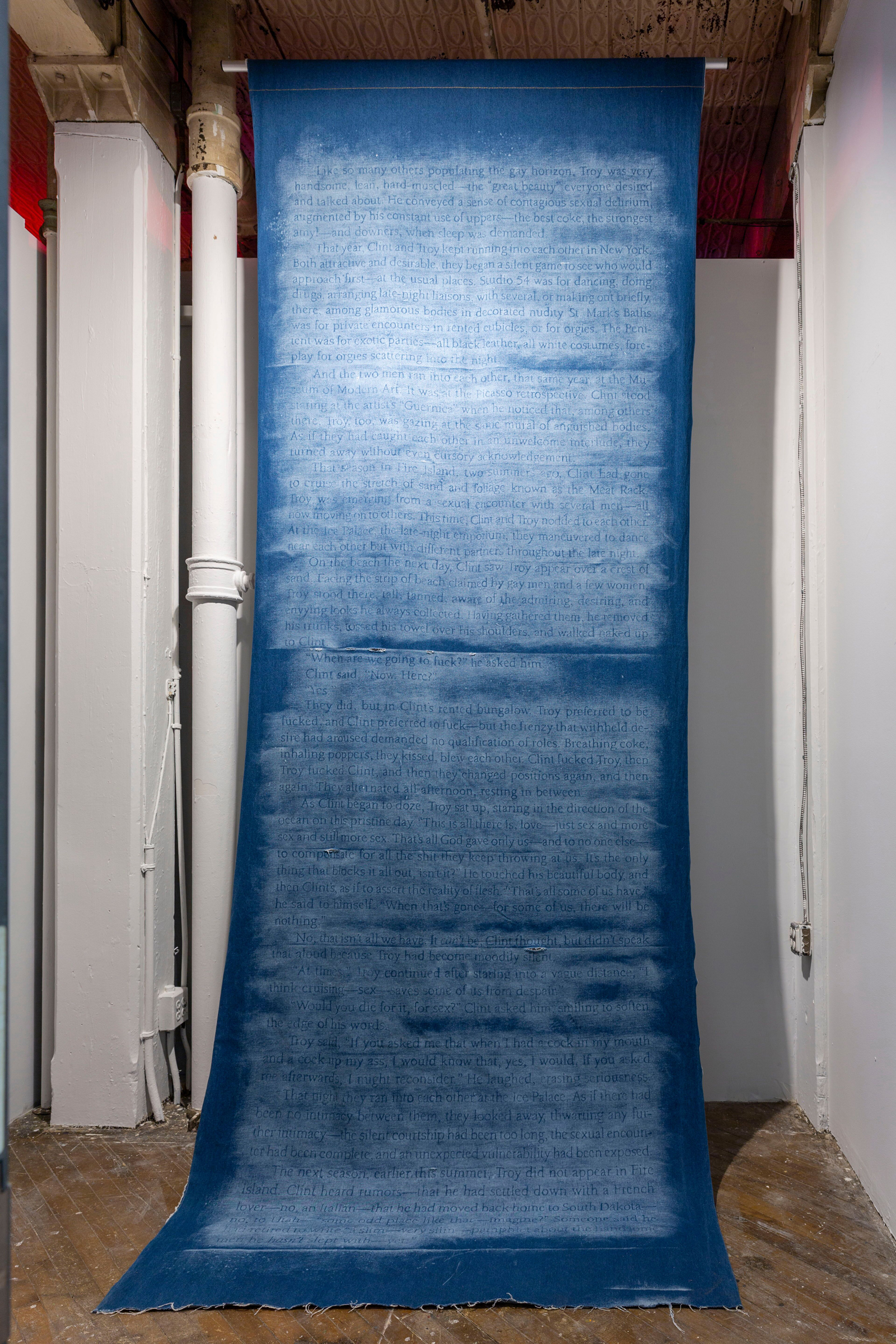 While I have worked with Martinez in the past, Bound to the Past is a departure from the project we collaborated on. Beyond the familiar medium, “New York, One Year Ago” is patently different in content from his other artworks. Martinez selected a quote from John Rechy’s “The Coming of the Night,” a book about a summer night in Los Angeles in 1981, to evoke the promiscuity of the time with the salacious details of a previous Fire Island affair between characters Clint and Troy. This tapestry is a prelude to the onset of AIDS that would decimate the queer community after the summer of 1981.